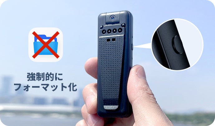 ビデオ録画状況で、「電源ボタン」を 8 秒以上押し続けると、メモリカード内のファイルが強制的にフォーマット化されます。