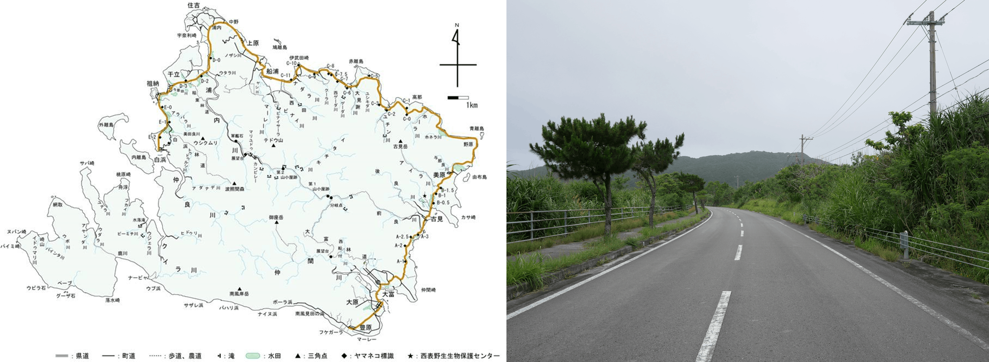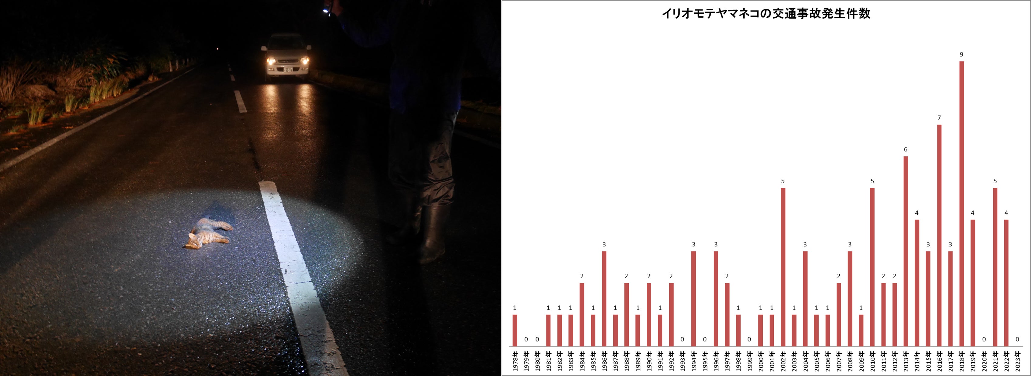イリオモテヤマネコにとって、現在大きな脅威となっているのが交通事故です。西表島唯一の幹線道路である県道215号南風見線は、島の南東端から北西部まで海岸線に沿って53km走っており、沿岸部のヤマネコの生息地を縦断しています。沿岸部のヤマネコは獲物を求めて常に山やマングローブ林、海を行き来していますが、その際に道路を横断することになり、交通事故に巻き込まれてしまっています。西表島の道路は改修工事により以前と比べ広く直線化され、速度を出しやすい状況になったほか、観光産業の隆盛に伴う交通量の増加など、島内の事情の変化もイリオモテヤマネコにとってマイナスに働いています。