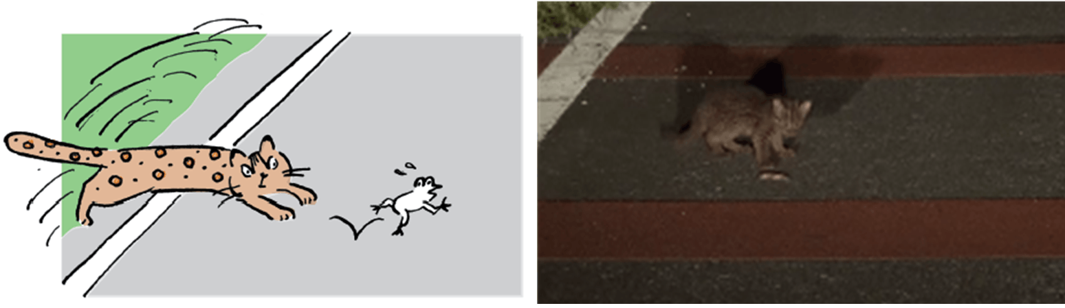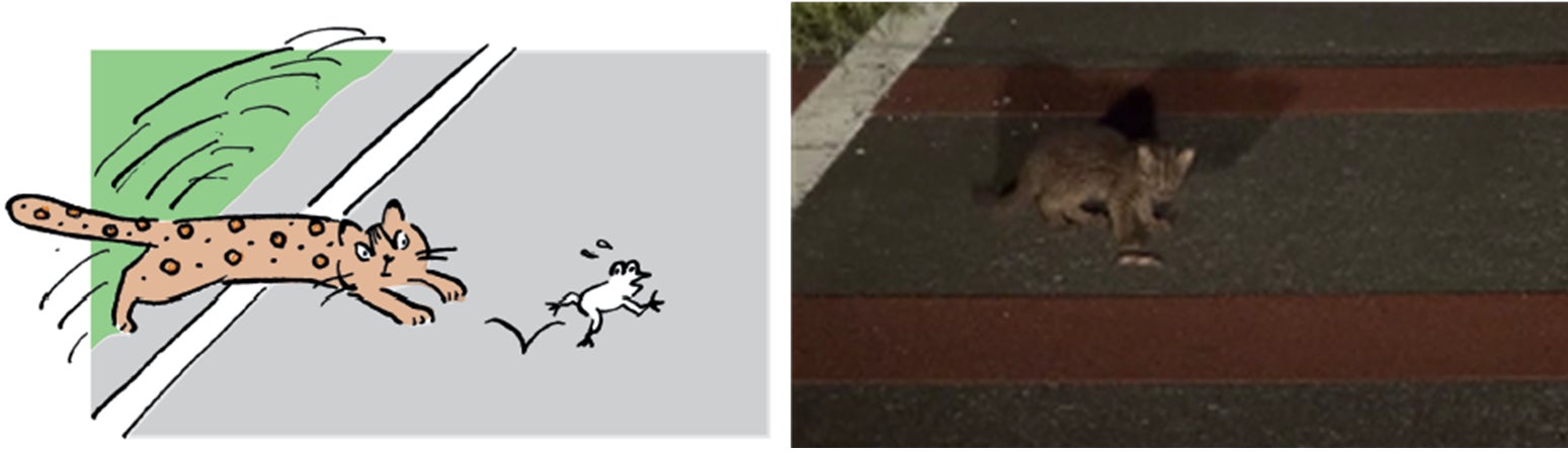 また、近年は道路を積極的に利用する「道路慣れ」したヤマネコの出没も問題となっています。見通しが良く獲物を探しやすい道路で狩りをしたり、轢かれて死んだヘビやカエルなどを食べるために道路に頻繁に出てくるのです。特に狩りが上手くできない、独り立ちしたばかりの若いネコや老齢の個体に多く見られ、路上出没を繰り返しているうちに通事故に遭い死んでしまうという事例も増えてきています。