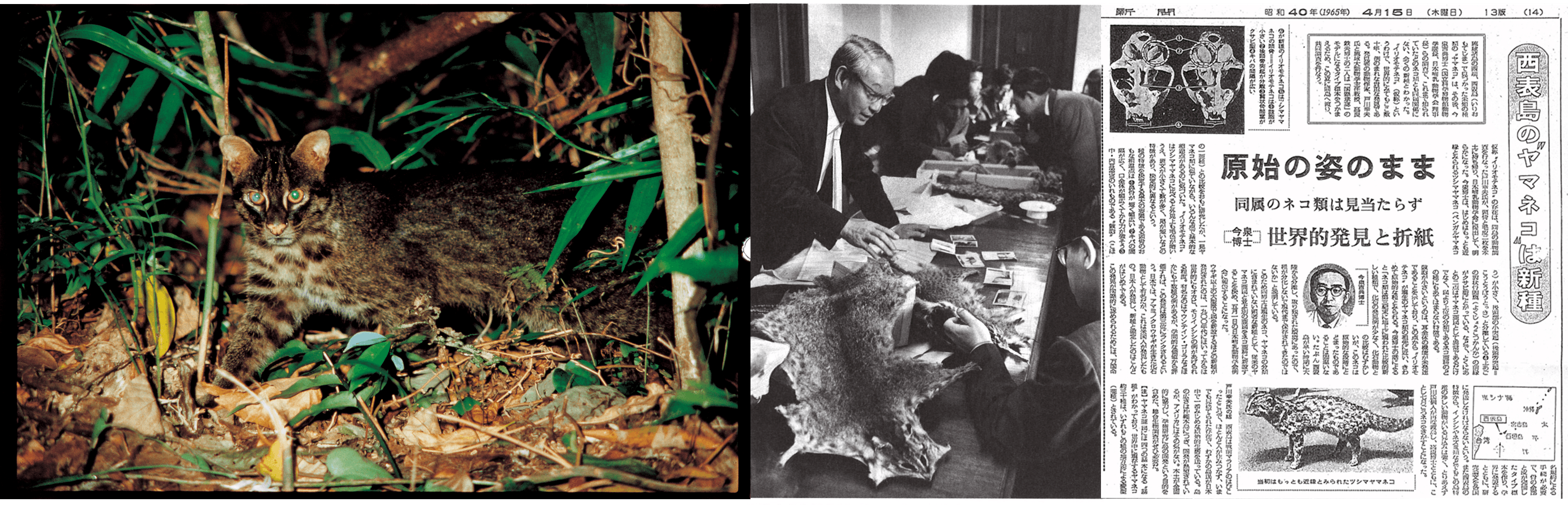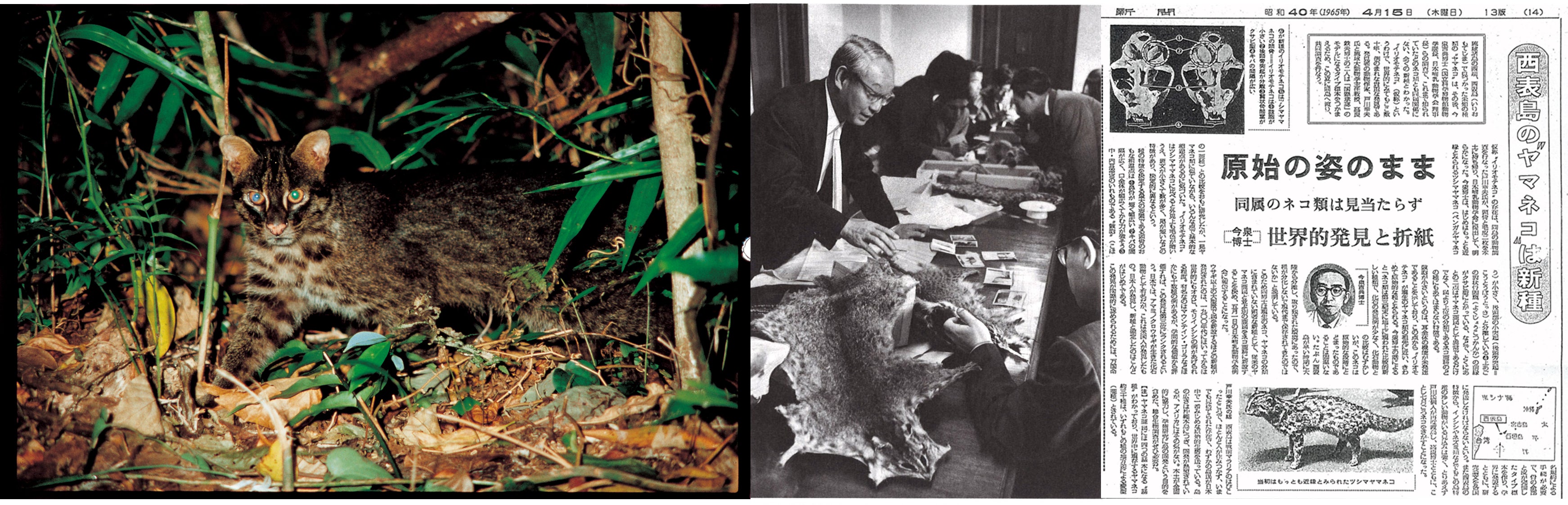 西表島の森にヤマネコが棲んでいることは、島の人には古くから知られていました。ヤママヤ―などとよばれ、イエネコとは区別されていたそうです。しかし、野生のネコ科動物が生息するためには一般にとても広い土地を必要とするため、西表島のような小さな島にヤマネコが生存しているとは考えられず、十分調査が行われませんでした。そのため、イリオモテヤマネコが学術的な意味で発見されたのは1965年と比較的最近の事です。JTEFの理事長 戸川久美の父である小説家の戸川幸夫が取材で西表島を訪れ、島民の協力を得て入手した毛皮と頭骨がきっかけで調査が行われることとなり、1967年の哺乳類学会で新種として認定されることになりました。