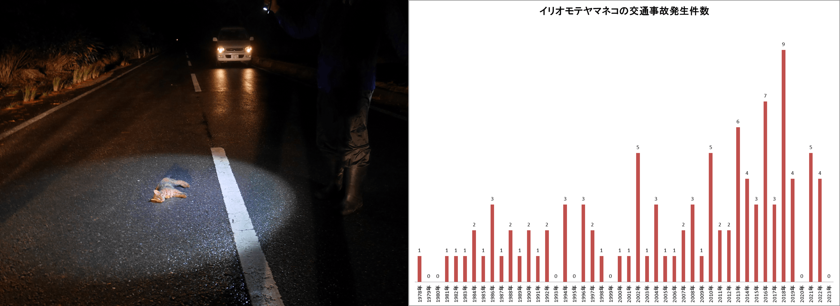 以上のような理由から、イリオモテヤマネコの交通事故発生件数は年々増加傾向にあり、特に2010年代に入ってからは急増しています。2016年には7件の交通事故が発生し、7頭全てが死亡。2018年には過去最悪の9件の交通事故が発生し、そのうち6頭が死亡しています。2020年には新型コロナウィルス蔓延の影響で21年ぶりに交通事故が0となりましたが、インバウンドの受け入れ再開や新型コロナウィルスの5類移行に伴う国内旅行者の増加などにより、これから交通事故リスクがさらに高まることが予想されます。