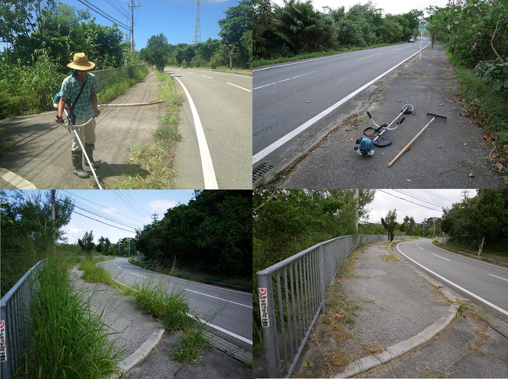 西表島は亜熱帯海洋性気候。温暖で多雨なため年間を通して植物が成長します。一方で、県道215号南風見線の除草作業は予算の都合もあり、十分に行われていないというのが現状です。そのため、集落外の道路脇や歩道などは1年のほとんど草本に覆われており、道路の見通しが悪くなっています。やまねこパトロールでは、特にヤマネコの目撃、事故が多発している地点を中心に除草作業を実施しています。