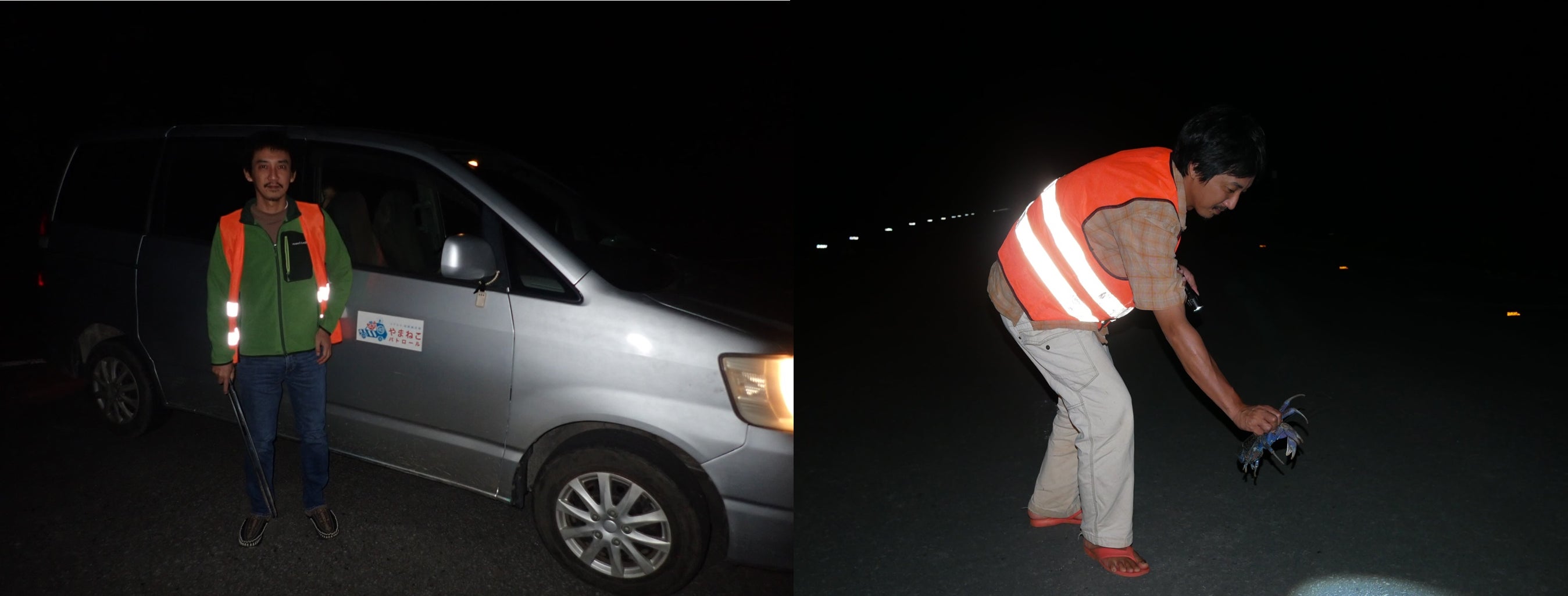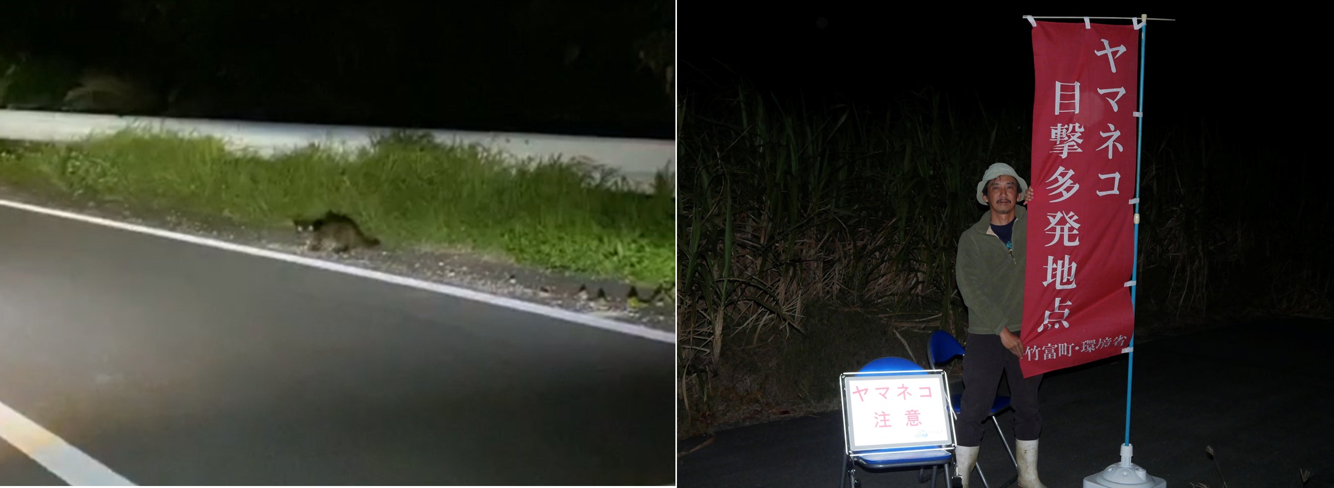 ヤマネコの交通事故対策として、沖縄県や環境省によりアンダーパス(道路下に設けられた野生動物用のトンネル)や、侵入防止フェンスの設置が試みられていますが、イリオモテヤマネコが交通事故死する状況は続いています。そこで我々は、夜間のパトロール活動や注意喚起など、実際のヤマネコの出現状況に応じドライバーに直接注意喚起したり、ヤマネコを道路に誘引する原因となる小動物を道路上から移動させる活動に力を入れています。