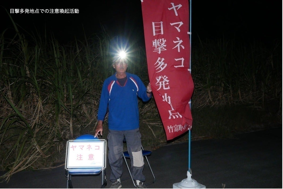 道路慣れしたヤマネコなど特定の個体が繰り返し路上に出没する地点では、緊急的に巡回をしたり、LED看板やのぼりなどを立て、直接ドライバーに注意を呼び掛ける活動を行っています。同時に行っている交通調査では、注意を呼び掛けている区間での速度低下が確認されており、交通マナーが改善されることが分かっています。また、通りかかったドライバーからヤマネコの出没情報の提供も受けることもあり、情報収集と共有の場としても重要となっています。