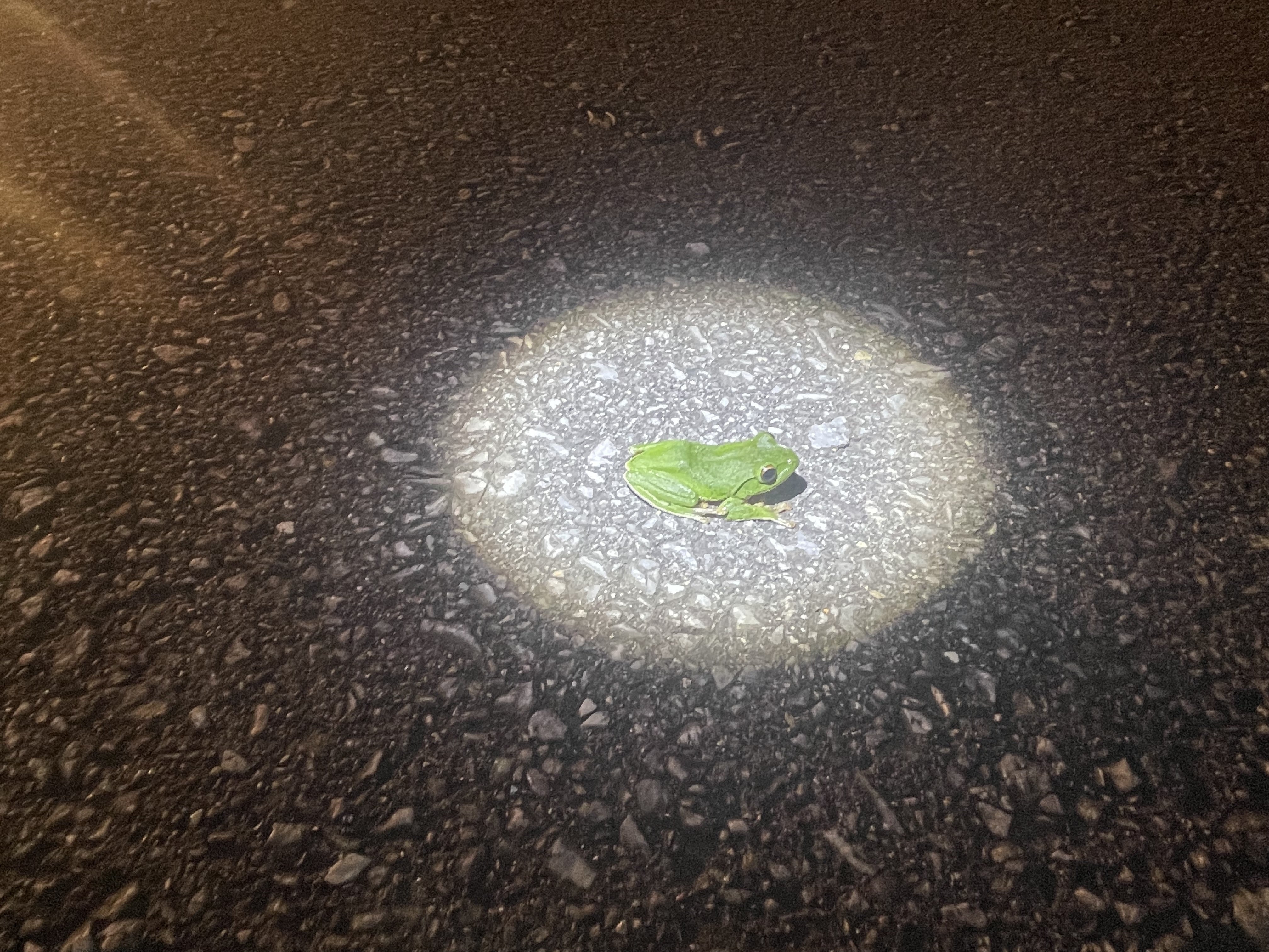 西表島もいよいよ寒くなってきました。連日北、北東の風が吹いて上原航路は欠航が増えています。昨晩のパトロール中の気温は21度ですが、風が強いので体感気温は10度台です。路上の生物もめっきり少なくなりましたが、そんな時でも、ヤエヤマアオガエルはポツポツと出てきます。そして、なぜかショウリョウバッタもよく見ますね。そういった生き物を狙いに来るリュウキュウコノハズク、アオバズクも道路を行ったり来たり。