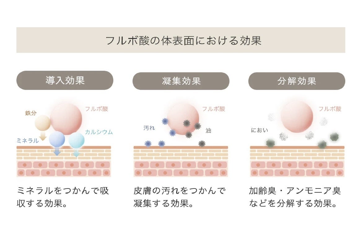 フミン酸は、皮膚に吸収されると角質化された肌の汚れを浮かして取り除く作用のある有機酸です。保湿力があり、皮膚が柔らかく肌のキメが整うため、すべすべした感触になります。