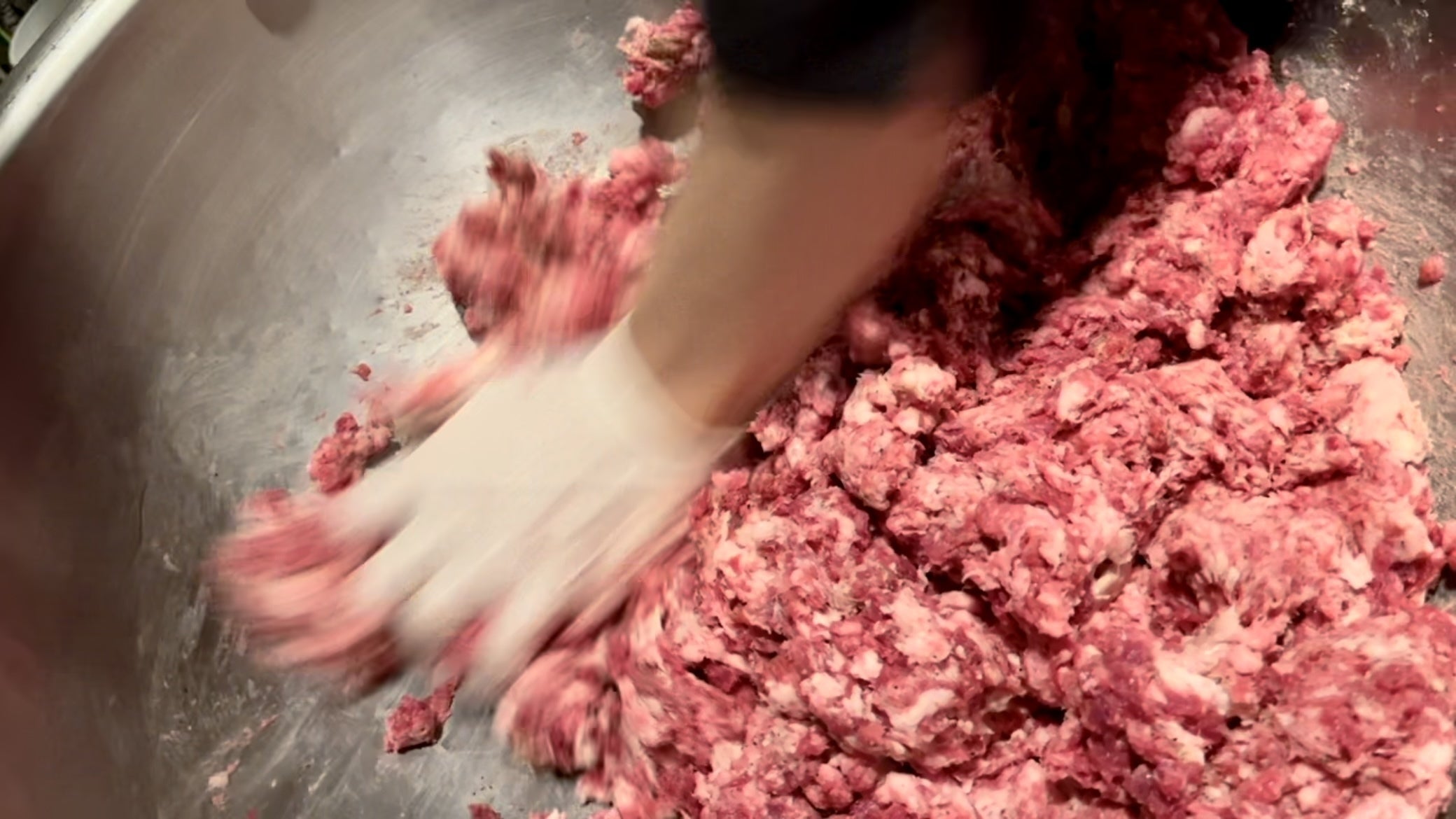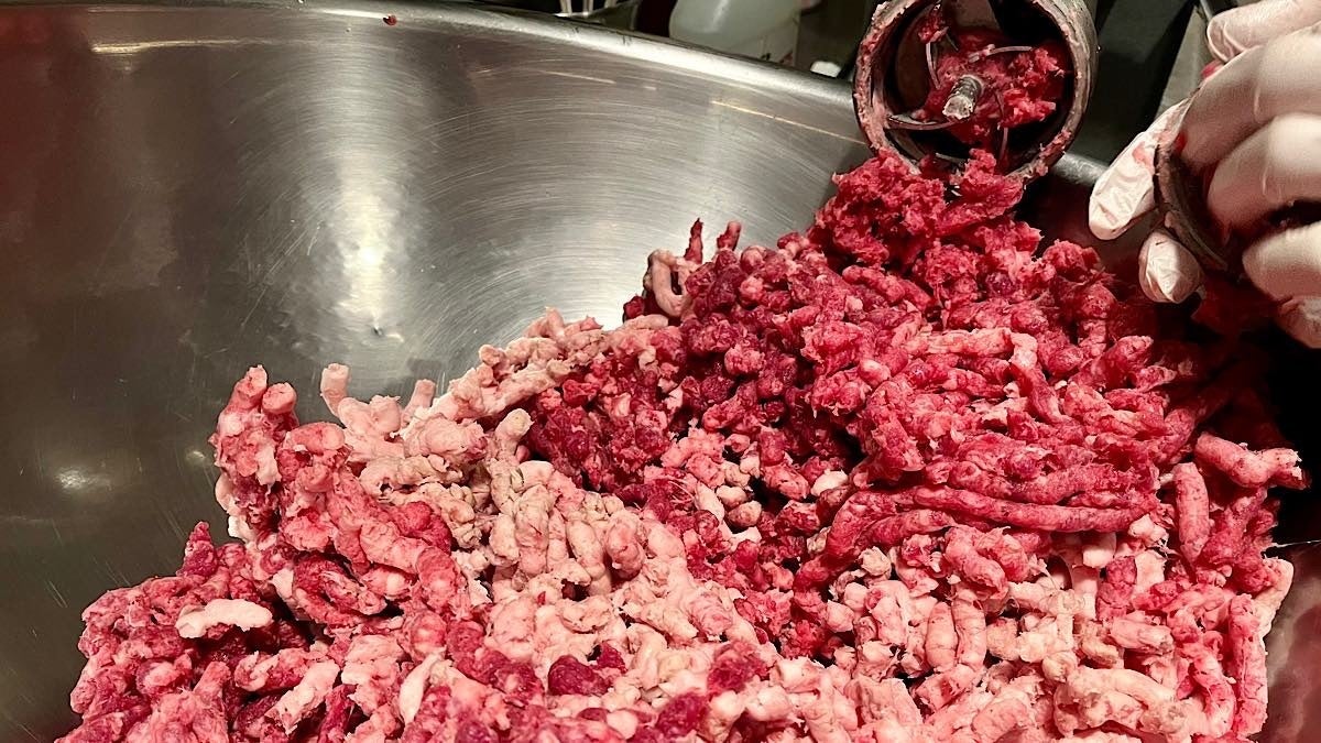 噛み締めた時に肉感を存分に感じてもらうために、やや大きめの口金を使い手早くミンサーにかけます。