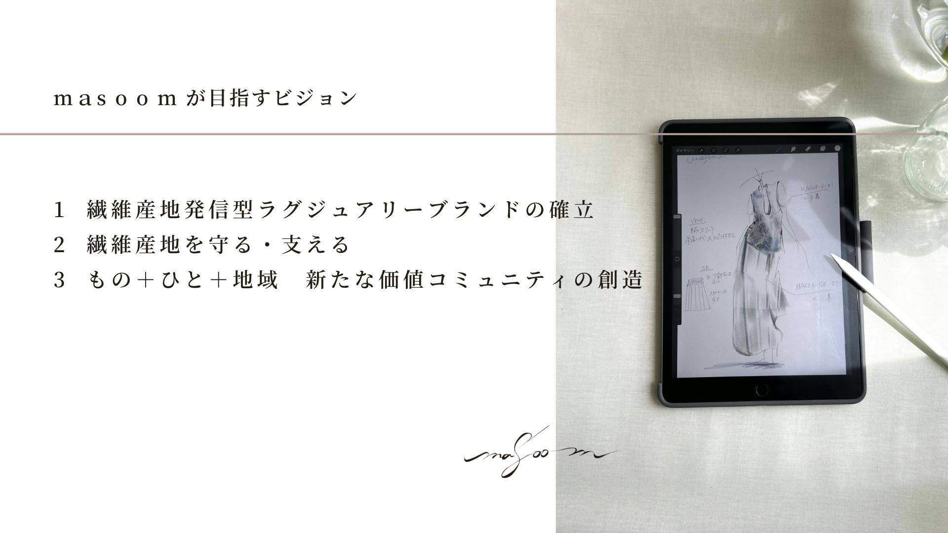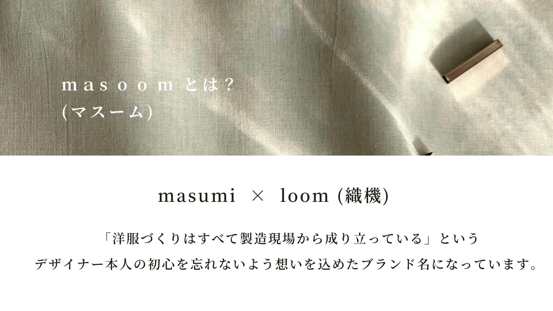 m a s o o m はデザイナーである私が繊維産地へ飛び込み、現場での経験を積んだ事からヒントを得た地域活性・持続化事業になります。「製造現場があってこそ、洋服は出来上がる」というデザイナー自身の理念のもと、繊維産地とタッグを組み製造現場の「魅力」がみえる新しいブランド価値観を作り上げていきます。
