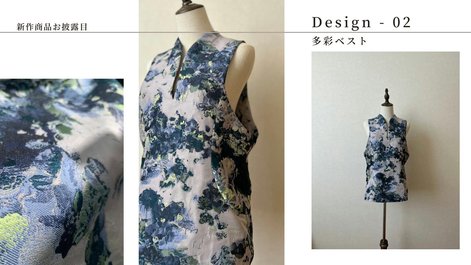 多彩なジャカード織物素材と曲線カッティングをマッチさせたプルオーバータイプのベスト。ネック周りの曲線的なラインがアンニュイな雰囲気を醸し出す1着です。カットソーやシャツと合わせたり、冬場はタートルネックに合わせると一気に華やかな雰囲気に。シンプルなアイテムと相性の良い1着です。カラーは「Miyako green」「Hyacinth blue」「Blue tiger eye」の3色展開になります。