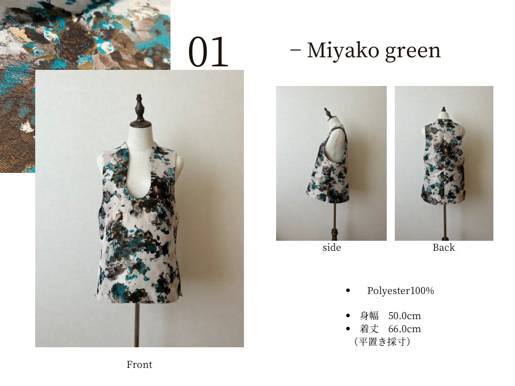 「裏面にも織り組織が反転する」ジャカード織物の特性を活かしたデザインベストです。脇部分のパーツは生地の表裏を反転した仕様になっています。1着で織物の「表と裏」両方を楽しむことが出来るアイテムです。カラーは「Miyako green」「Hyacinth blue」の2色展開になります。