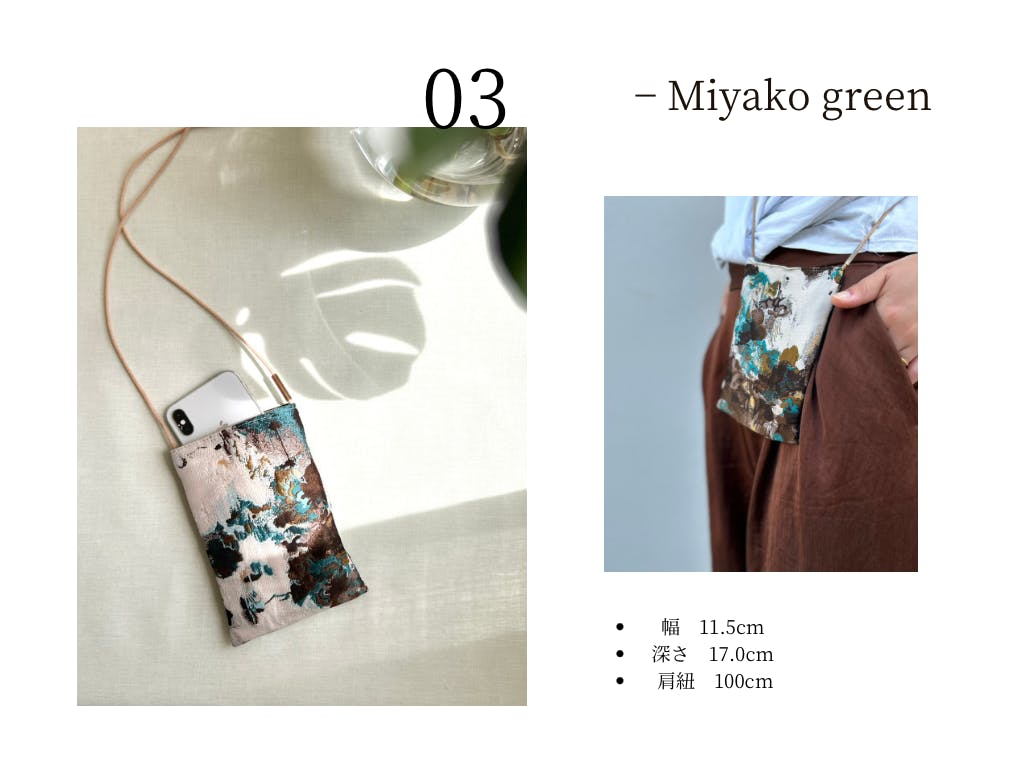 製造の過程で生まれる「端布」をアップサイクルしたアイテムになります。ブランド設立から大人気のアイテム。スマートフォンがすっぽりと入る大きさで、ポケットのないお洋服時の「ポケット代わり」としてもお使いいただけます。カラーは「Miyako green」「H
