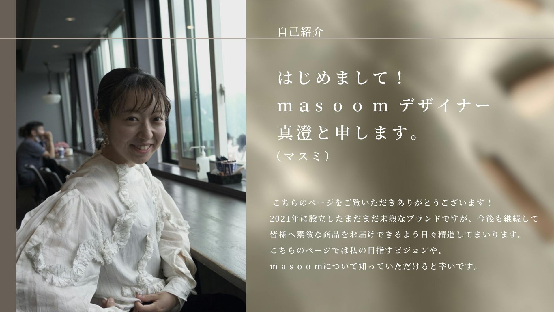 こちらのページをご覧いただきましてありがとうございます! ブランド名はm a s o o m(マスーム)と読みます。繊維産地での勤務経験を経たデザイナーが設立した地域活性化事業になります。クラウドファンディング初となる新作商品をお披露目いたします!商品ラインナップを楽しみながらご覧ください。