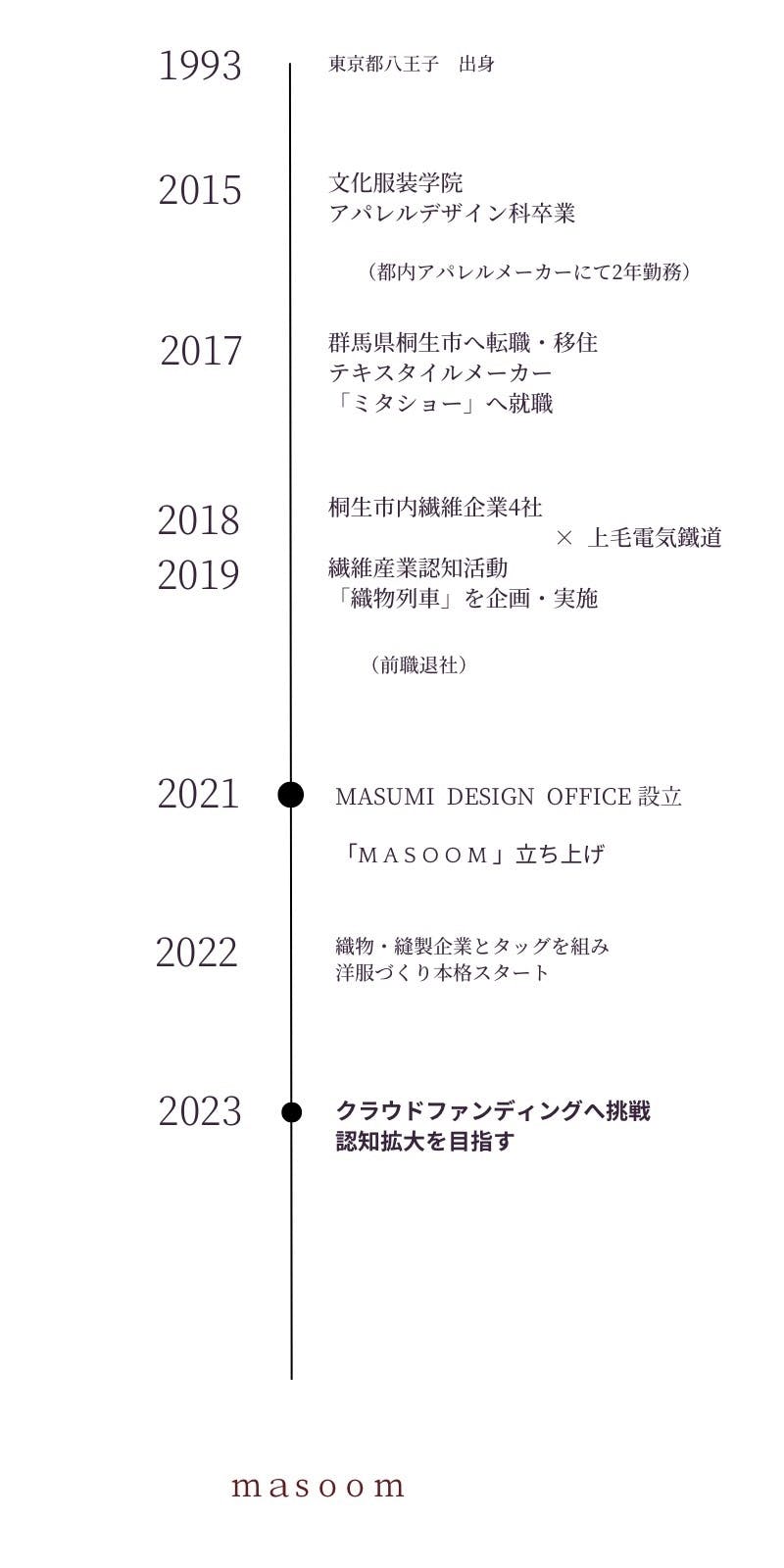 専門学校から培ってきた洋裁のノウハウを活かして、自分に出来ることを模索していこう。そして自分にしか出来ないことを形にしていこう。そのように決意し m a s o o mブランド設立に至ります。衰退や廃業が相次ぐ繊維産地を現場から見てきた中、私が目指すビジョンは「 m a s o o m というブランドを通して高級織物製造の本場・桐生繊維産業を守り、職人さんが苦しまないような仕組みづくりをする事、そして織物の魅力を業界内外へと発信していくこと」だと確信しました。