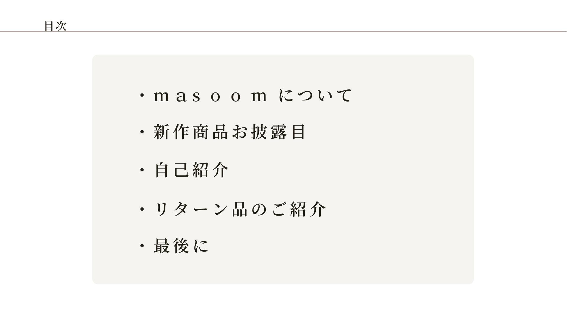 企画〜製品化まで、何度も修正を重ねてきたアイテムが仕上がりました!丹精込めた m a s o o m 新商品、ぜひ商品ラインナップを楽しみながらご覧ください!