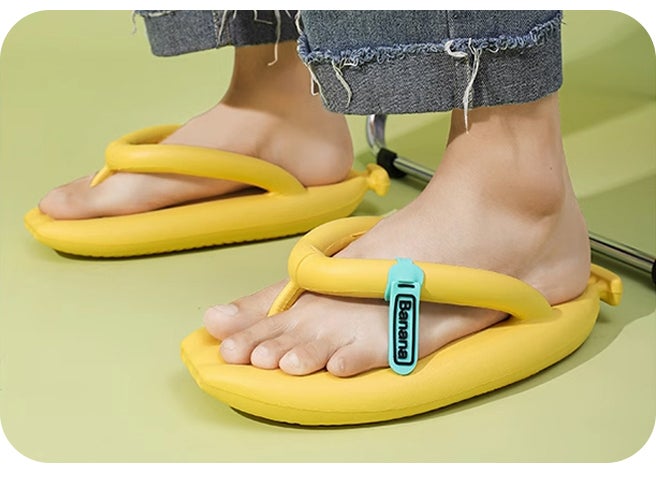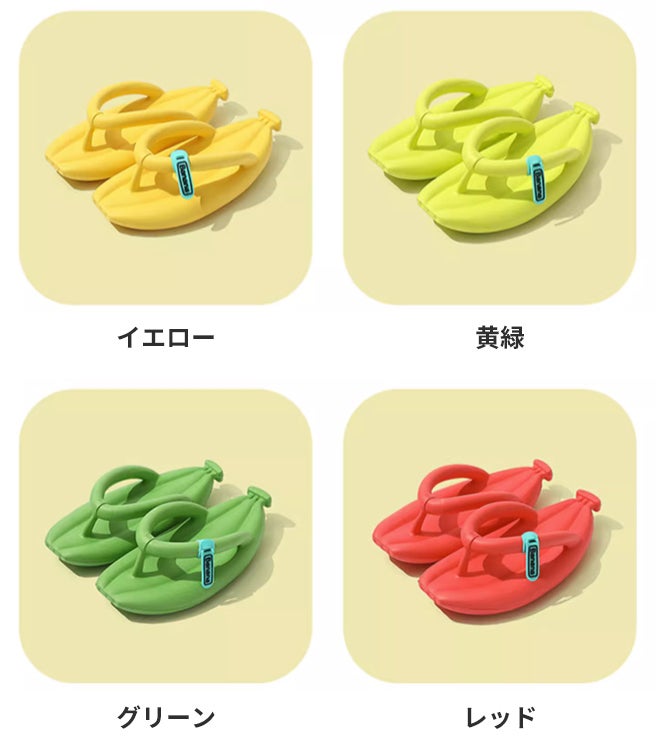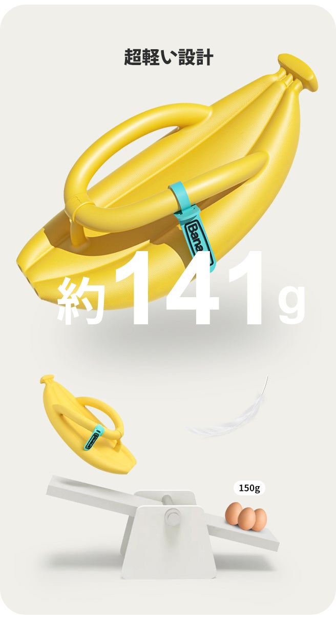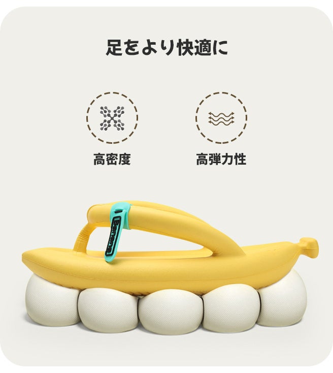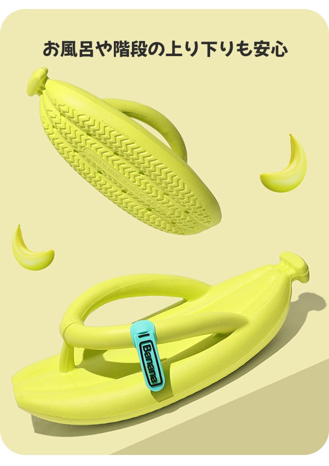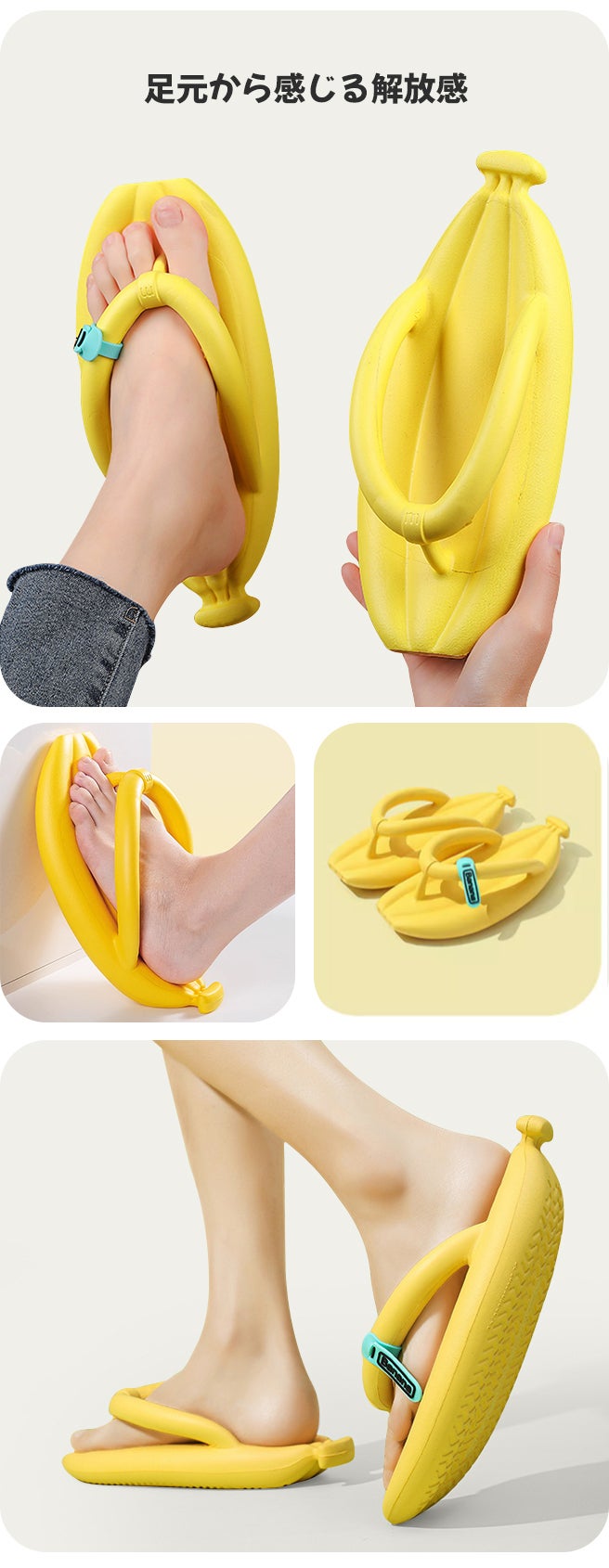 つい惹かれてしまうバナナのようなデザインです。軽量で滑りにくいだけでなく、鼻緒タイプなので通気性も抜群です。履いているだけでも気分が上がりそうなアイテムは、ギフトにもおすすめです。