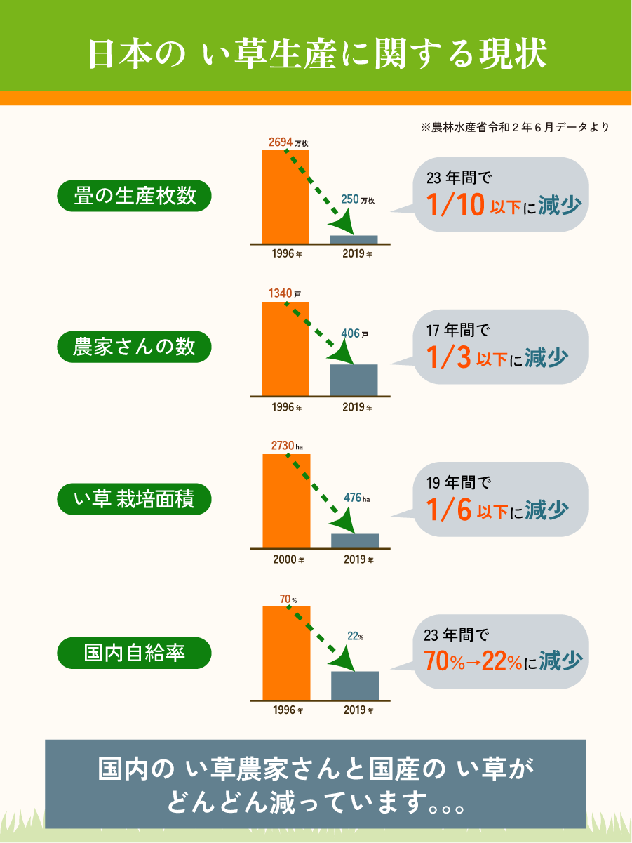 日本国内における「い草の農家」も1/4以下になり、国内自給率は2019年時点で「22%」にまで落ち込んでいます。