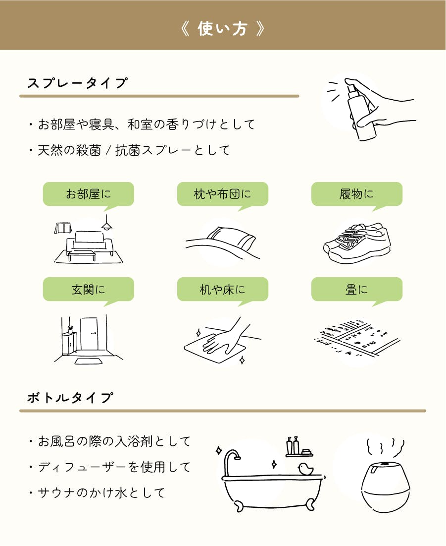 天然のルームスプレー・抗菌スプレーとしてお部屋や寝具、履き物、和室などにご使用いただけます。