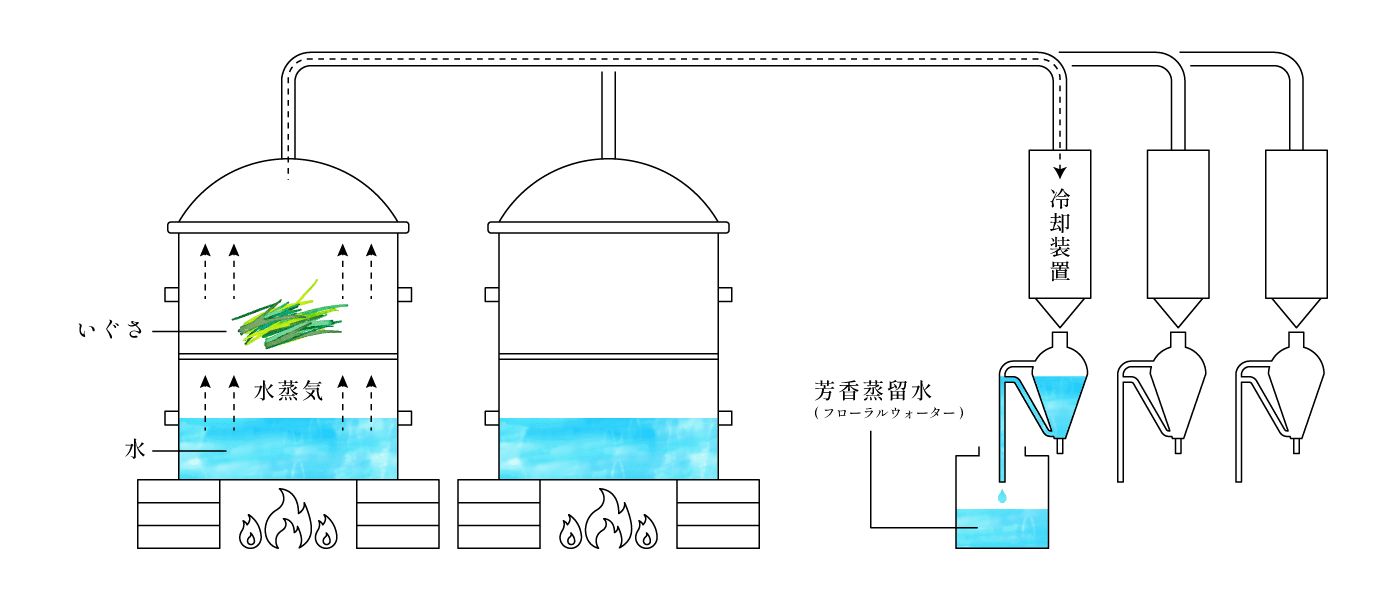 スギやヒノキといった日本古来、住まいに用いられてきた木々の香りというのは、私たちの身体がとても良く覚えていて、懐かしく良い香りがします。この度、南山さんから抽出を依頼された「い草」は精油ではなく芳香水となりますが、日本人が好きな畳のいい香りがするフローラルウォーターが精製出来ております。きっとたくさんの人に気に入って頂けるものと確信しております。