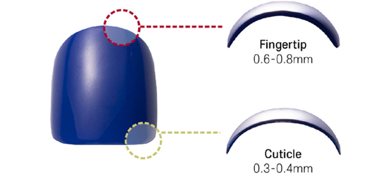 指先側はより厚く、本物の指先のように演出でき、キューティクル側はより薄く曲げやすく、自爪にフィットします。さらにカットしやすく、どんな形にもフィットするようにトリミング可能です。