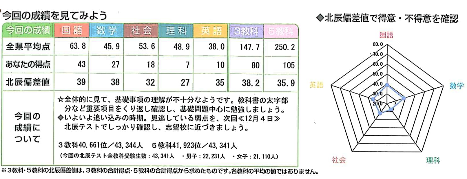 中学3年次の模試の成績です。映画で話題になった『ビリギャル』の高校生は名古屋市内でも有名な進学校からの挑戦でしたが、彼は正真正銘、底辺高からのスタートです。参考までに、中学3年生の時の模試(北辰テスト)の成績表を掲載します。