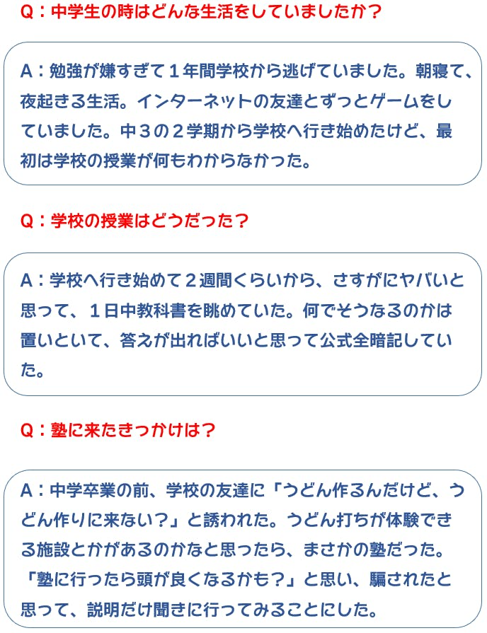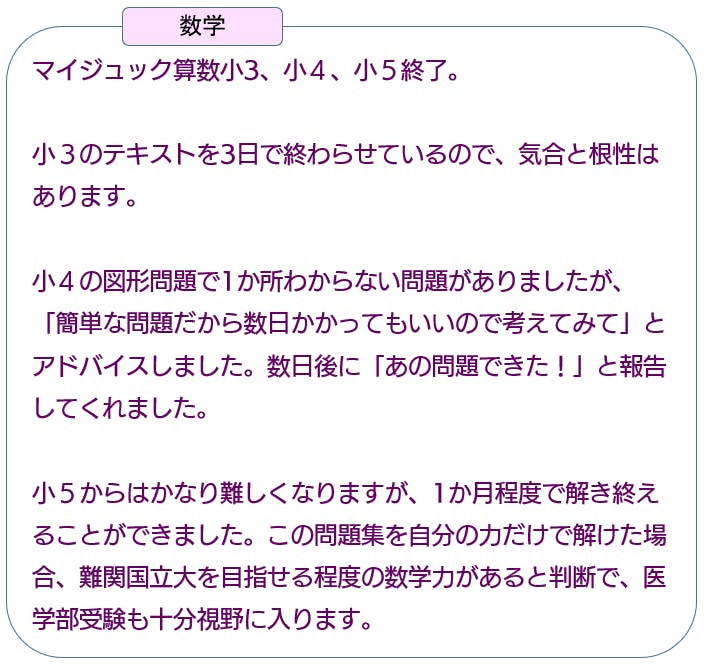 学校でも塾でも、毎日必死に、、、ではなく楽しく勉強しています。「勉強が嫌いで辛いもの」だと思っていた中学生時代とは別人のようになっています。勉強は本来楽しいものです。彼の貴重な経験を記録に残し、未来ある子供たちへの道しるべとしたいと考えています。