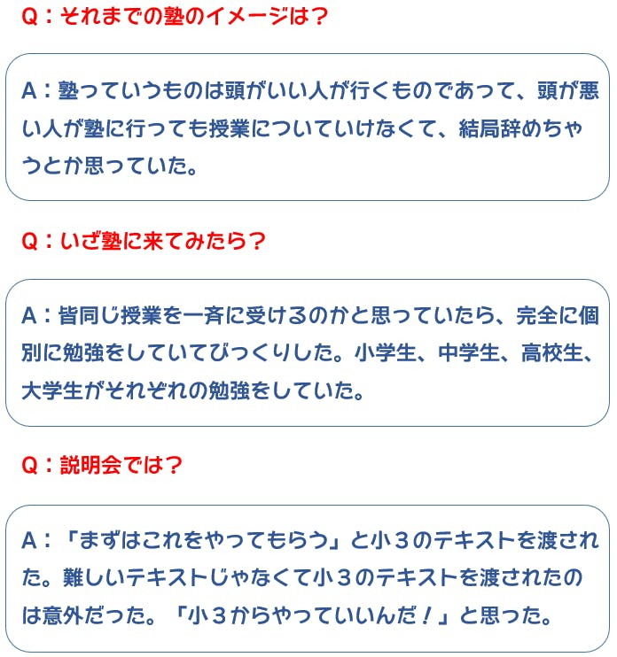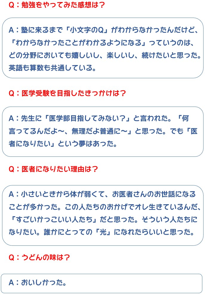 説明会の時、私の話を真剣に聞いていました。理解力が高く、真面目で持続力もあります。偏差値30台と聞いていたので信じられませんでした。「この子なら医学部受験も夢じゃない」と思い、医学部を目指すことを勧めました。