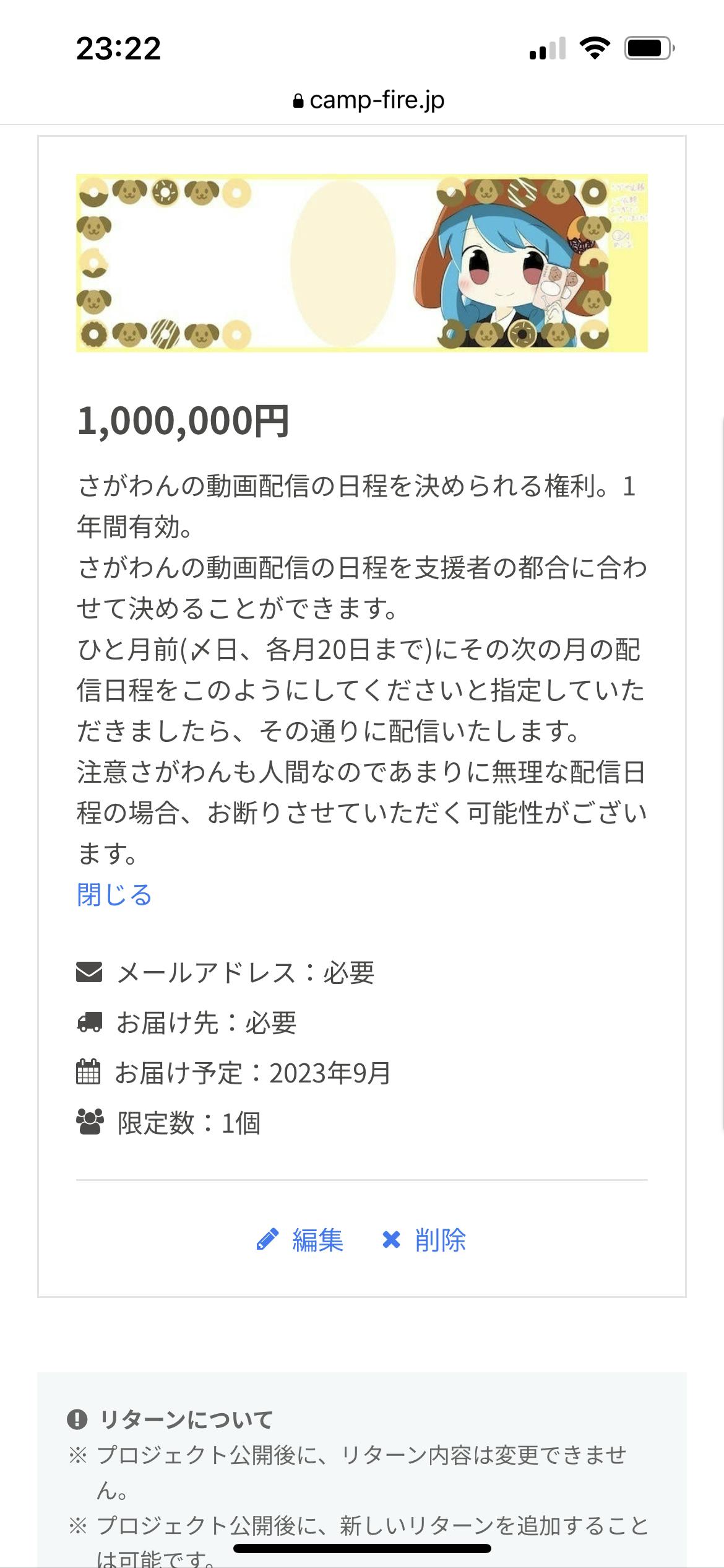 1000000円、1年間の間、支援者の都合により、さがわんの配信日程を変更する権利(1ヶ月前に申請する必要あり、例:5月20日までにさがわんにDMなどして、6月からの配信は毎週土曜日の19時から5時間配信するように変更など)