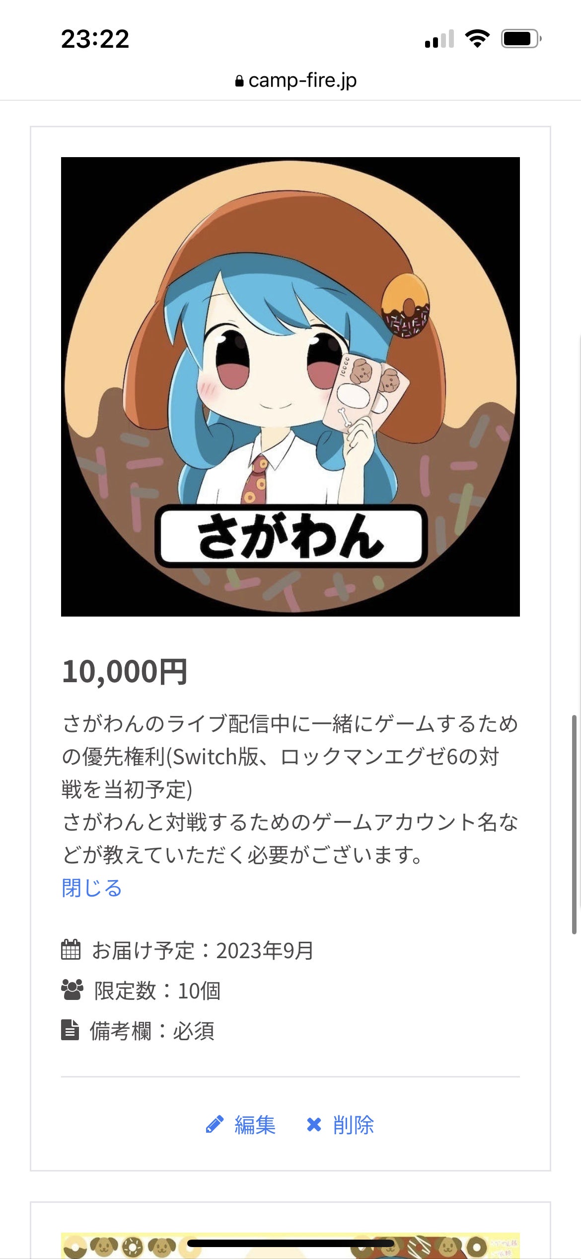 10000円、さがわんのライブ配信中に一緒にゲームするための優先権利(Switch版、ロックマンエグゼ6の対戦を当初予定)