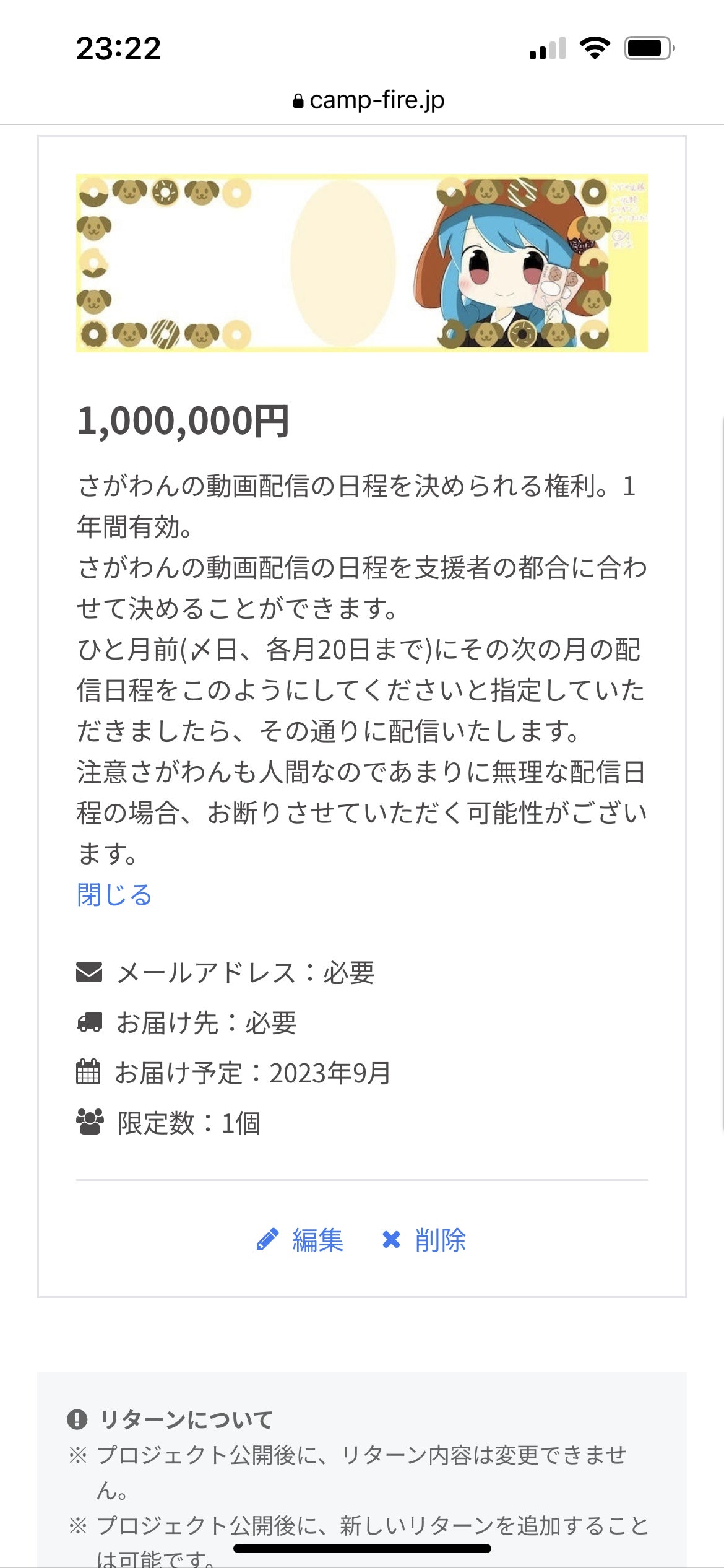 2023年9月7日(さがわんの誕生日なので記念配信として)ゲーム配信開始と同時にリターンの提供開始(配信機材の確保でき次第のため、前後する可能性あり)