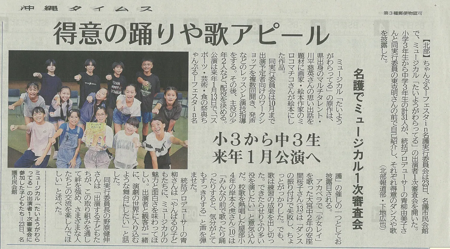 僕には沖縄弁のセリフが難しかったけど、地元のみんなならもっとリアルな芝居ができると思うし、沖縄の空気の中でなら歌もダンスももっともっと楽しくなると思います。演じる経験は、きっと僕みたいに自信がつくと思うし、お客様もみんな笑顔になれると思います。 沖縄の太陽とガジュマルの森の下で「ちゃんぷるフェスタin名護」を成功させて、名護の子どもたちの挑戦を応援しています!
