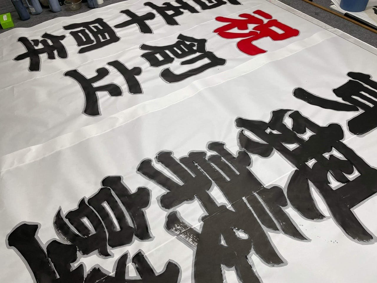 さて、創立150周年ねぷたですが、制作も着々と進んできています。写真は扇ねぷたの両肩に貼られる文字になります。