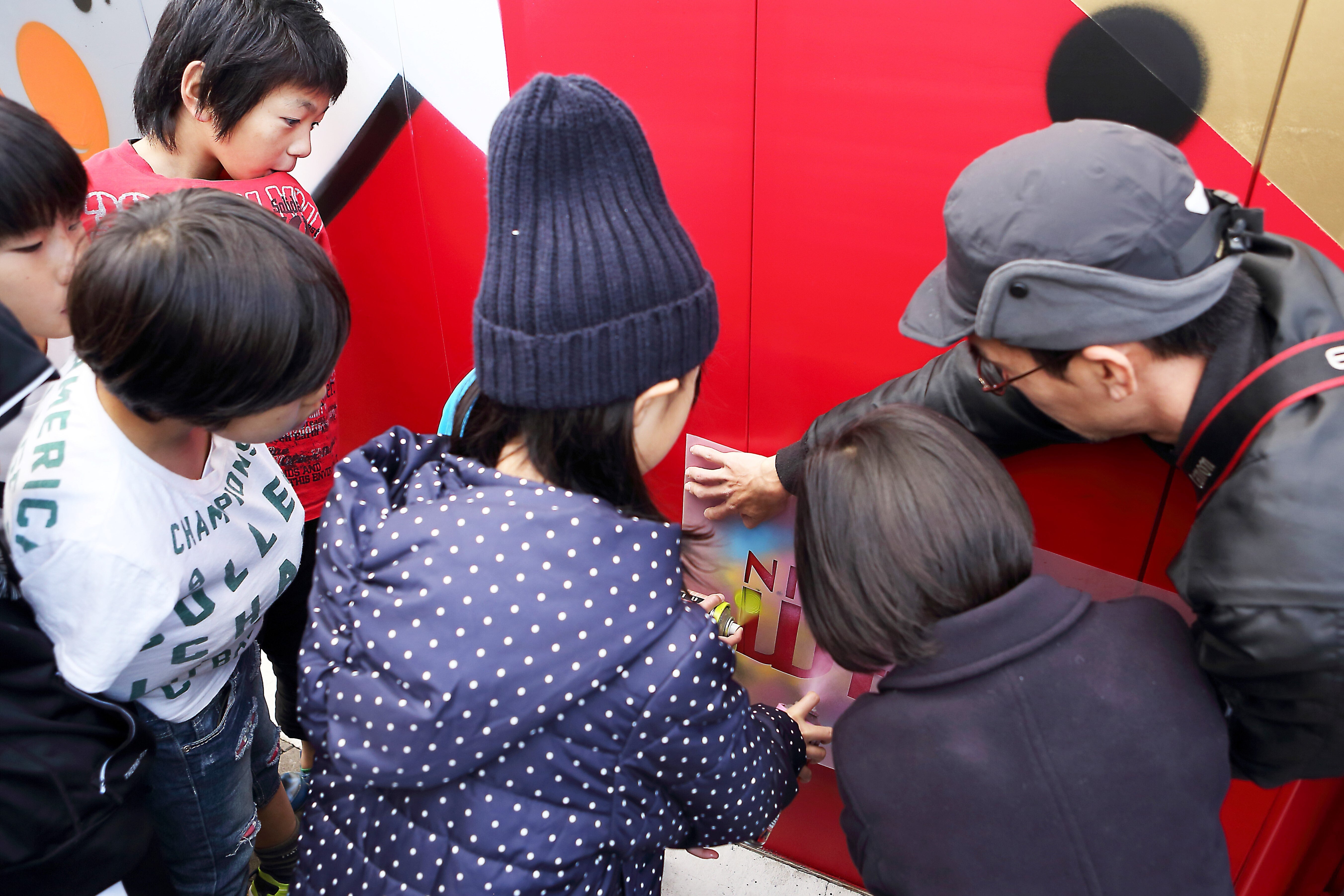 西成WAN第3弾でロゴ入れを手伝う子供たち