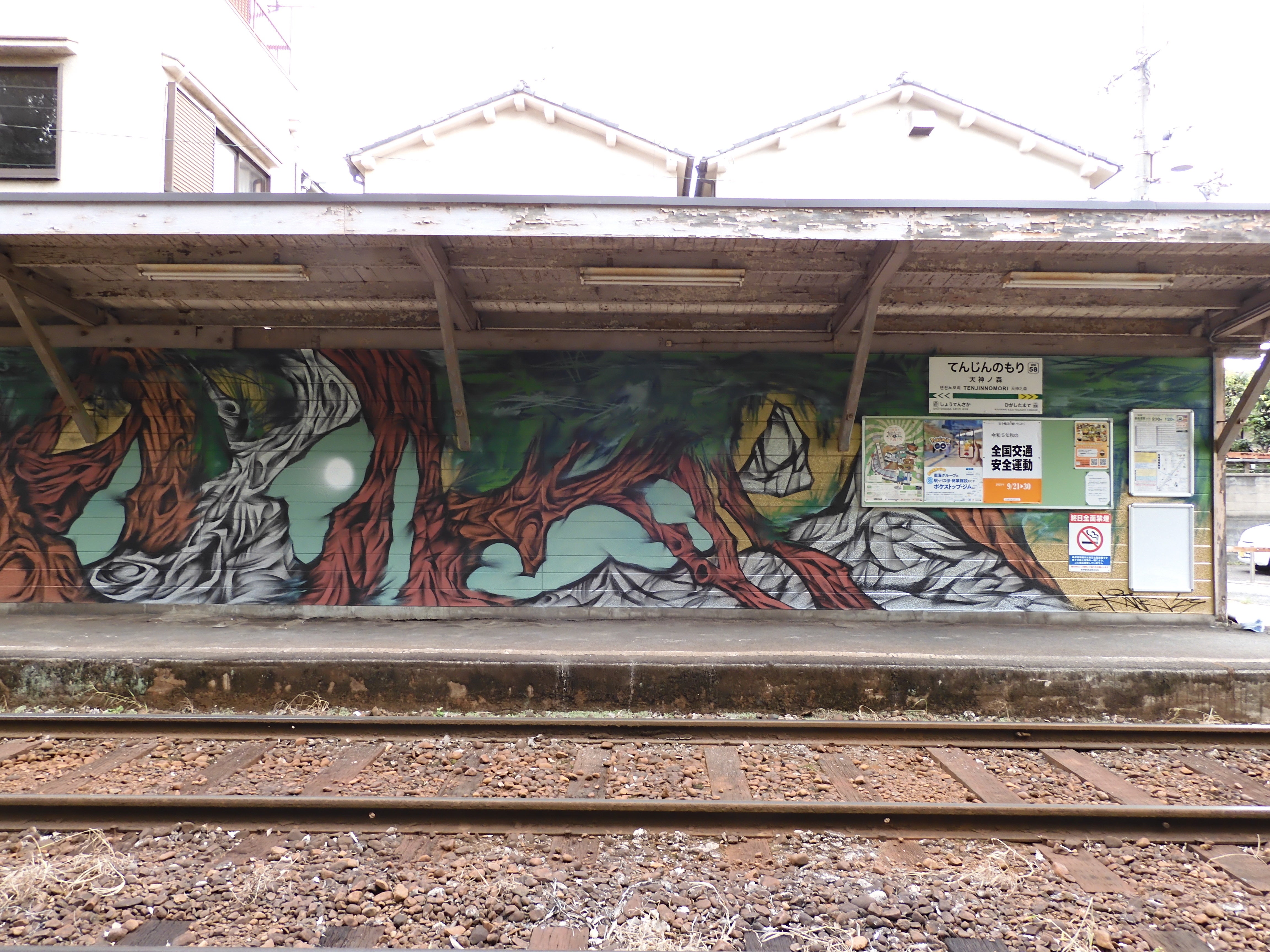 2023/09/22 11:33西成WAN天神ノ森駅舎の下り駅舎,2023年9月21日昼過ぎに完成しました。今回の参加アーティストは,KANEONEさん。わざわざ神奈川からお越しいただきました。西成WANは地域の歴史や事情,アート現場周辺の状況などをアーティストにお伝えして,アート内容については,いつもアーティストに一任しています。アート作業初日,KANEONEさんは,駅舎周辺を歩いて,駅舎から天神ノ森天満宮の森をしばらく眺めてから,下書きすることもなく,勢いよく描き始めました。作業を見ていると,壁に彫刻しているかのような,絵を削り出しているような印象を受けました。出来上がったアートは,スプレー缶で描く長所を活かして,微妙な陰影とはっきりとしたラインが織り交ざったもの。まるで能舞台の背景にある松のような,屏風絵のような,和風で力強く生命力あふれる作品に仕上がりました。ストリートアートならではの,この場所でしか成り立たないような作品で,さすがはKANEONEさんだな,と感激しました。アート作業中に声をかけてくださった地元の人によると,金・銀・銅の色が,夕暮れから夜にかけてとても映えるとのことでした。ぜひみなさん,現場へ作品を見に行ってください。最寄り駅は,当然,阪堺電車天神ノ森。南海の岸里玉出駅からも徒歩数分です。西成WAN実行委員長 松村嘉久 もっと見る西成WAN天神ノ森駅舎