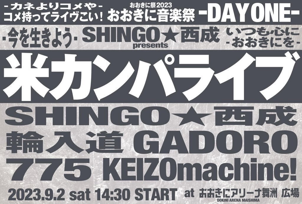 我らが仲間のSHINGO★西成さん,来週9月2日(土)の14:30から,おおきにアリーナ舞洲広場にて,毎年恒例となりつつある「米カンパライブ」を開催します。今困っている人に金よりも米を,という趣旨で,入場料の代わりに米を持って来て,というアツいライブです。西成WANやグラフィティのファンのみなさまも,ぜひ,お時間があれば,お米を持って,SHINGO★西成さんのライブに駆け付けてください。SHINGO,頑張れ!みんなで応援しましょう。