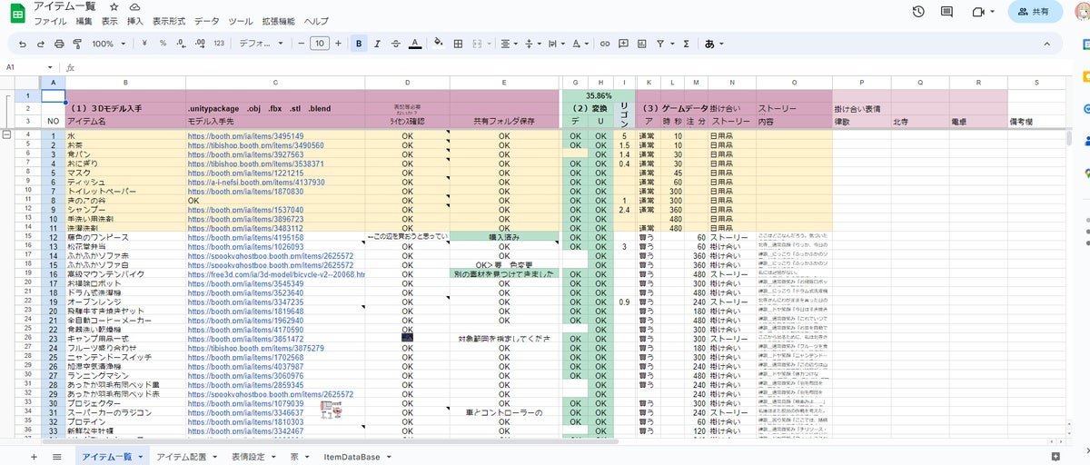 ↓こんな感じに、150近くある3D素材を用意して、ライセンス確認して、配置して、管理して、進めていました。