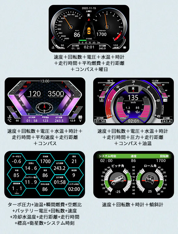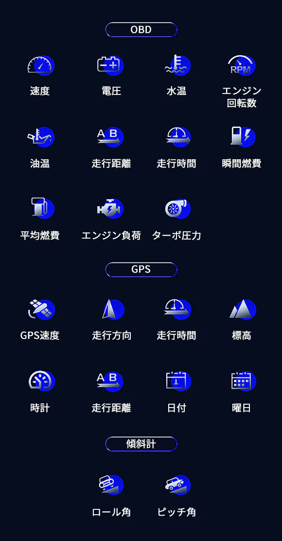 OBD2+GPS+傾斜計の3つのシステムに対応し、より多くの車両情報が瞬時に把握できます。カラフル&大画面のディスプレイで、データの変化も読み取りやすくなります。車を適切に管理することにより、故障診断がより正確で、時間的なロスや工賃を削減し、事故を未然に防ぐことができます。