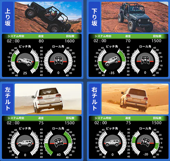 高性能6軸ジャイロスコープ搭載。直感的に車両の姿勢変化を把握し、野外運転や山道での走行でも安全性を確保できます!