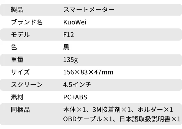安全な運転のため、KuoWei F12は6種類の警報機能を搭載しています。異常値を検出すると警告アラームを鳴らし、車両や運転状態を知らせます!