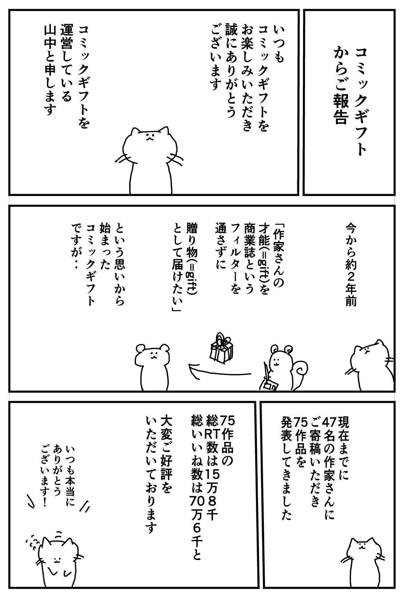 商業誌とは違った面白さを届けたいと思って始めたcomic giftですが、開始から2年で47名、75作品を掲載することができ、リツイートが1万回を超える作品もたくさん生まれました。