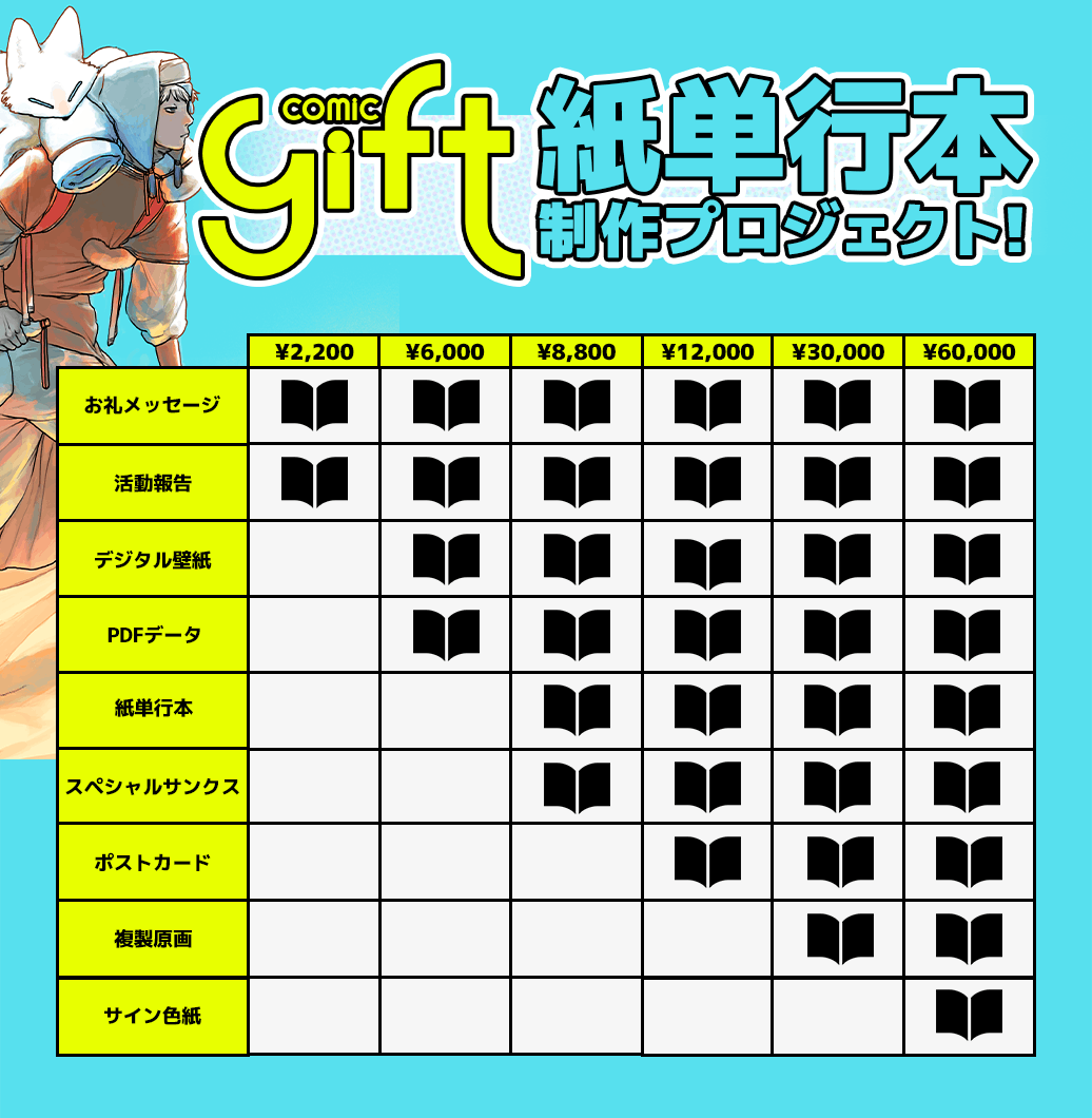 2024/03/29 16:37支援者の皆様お世話になっております。comic gift運営チームです。この度はご支援をいただき、誠にありがとうございました。皆様にお力添えをいただいたおかげで、無事にプロジェクトを終える事が出来ました。クラウドファンディングのご支援や拡散などにご協力いただきました全ての方々に改めて感謝申し上げます。クラウドファンディングはこれで終了しますが、 今後も公式Xアカウント(@comic_gift_web)で情報発信をしてまいりますので、引き続き宜しくお願いいたします。comic gift運営チーム もっと見る