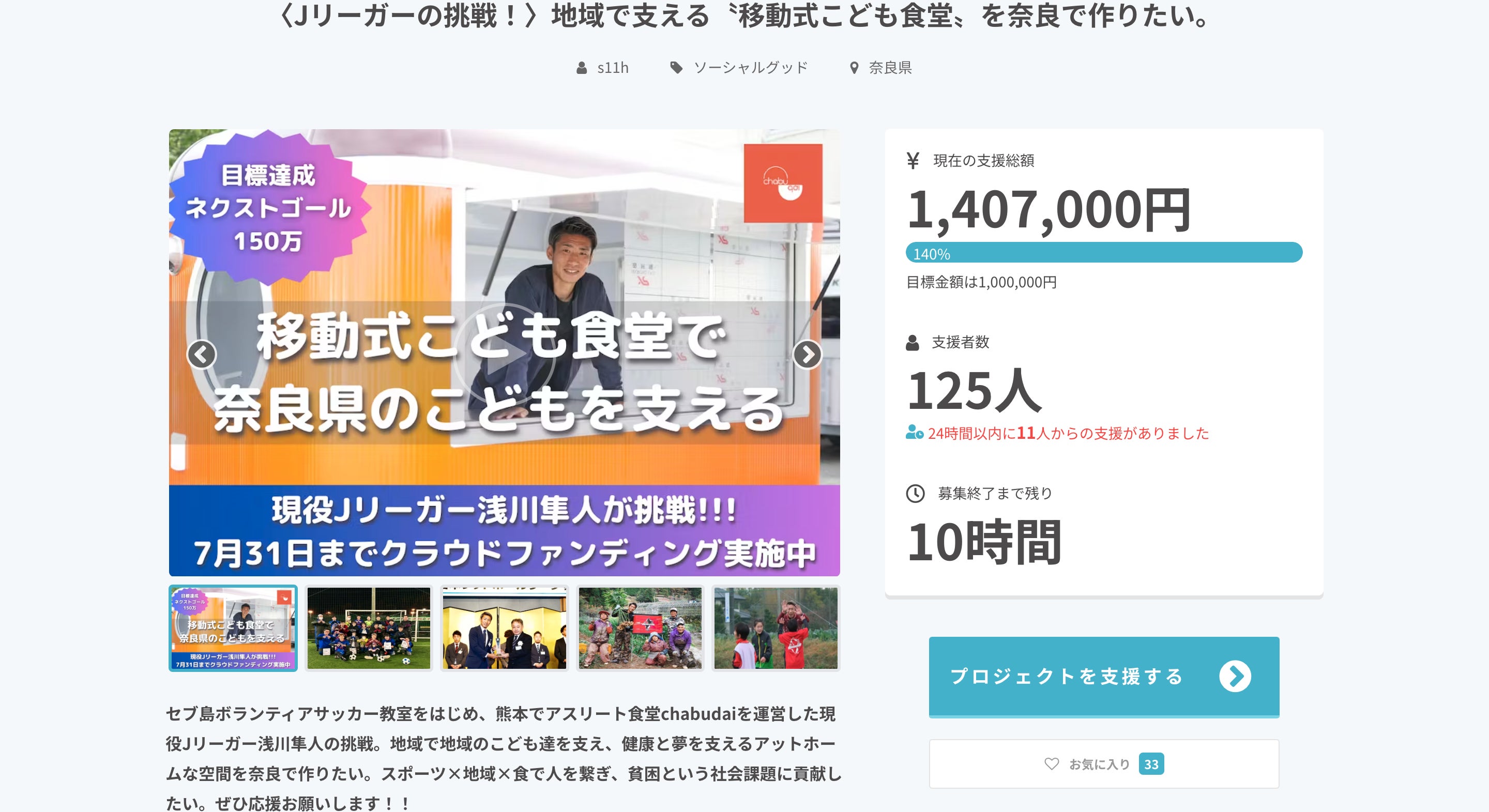 皆さんこんにちわ。いつも応援ありがとうございます。浅川隼人です。クラウドファンディングも残り10時間となりました。現在¥1,407,000125名皆様本当に応援、拡散ありがとうございます。Nextゴール¥1,500,000に向けて残り¥100,000を切りました。正直ここまで来れるとは思ってもいませんでした。これも全て皆様のおかげです。本当に感謝しております。早いようで長かった2ヶ月間。悔いなく走り抜けてきました。途中で挫けそうになりながらも皆様から届く応援や、SNSでの応援メッセージが支えとなり、ここまでくることができました。今日でクラウドファンディングの挑戦は終了しますが、これからも皆様と共に歩めること。多くのこどもたちの支えの場になれるように、今後も精一杯頑張っていきます。今日の午前中にキッチントレーラーが届いたと連絡が入り、いよいよ始まるんだなと実感しております。〝食の提供や夢を持ってもらうきっかけとなるアットホームな空間〟必ず素敵な、奈良になくてはならない場所にしていきます。最後の最後までぜひ応援よろしくお願いします。これからも多くの皆様と共に歩めることを楽しみにしています。浅川隼人