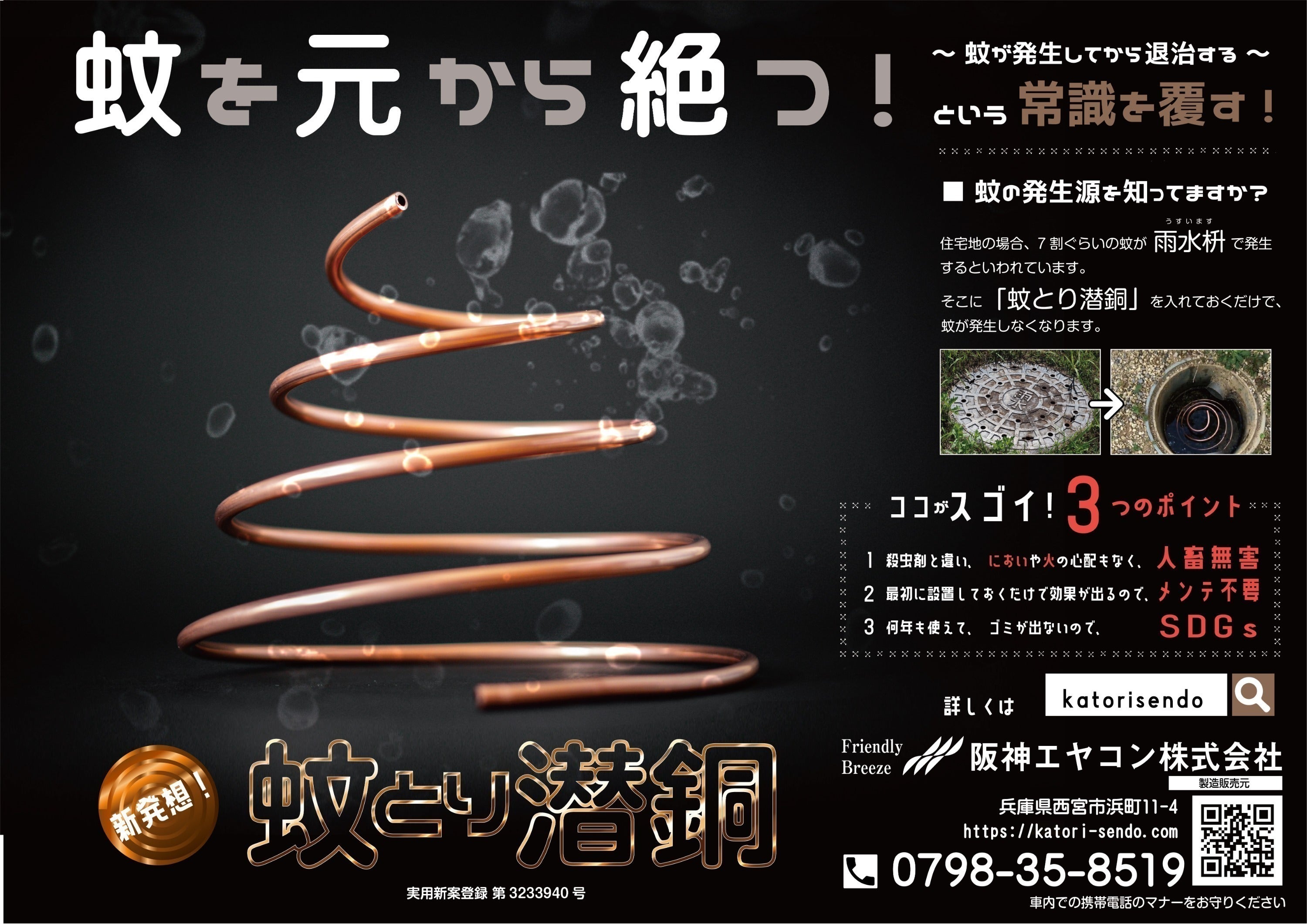 「蚊とり潜銅」は雨水桝に設置するだけで蚊の発生を抑えられます。