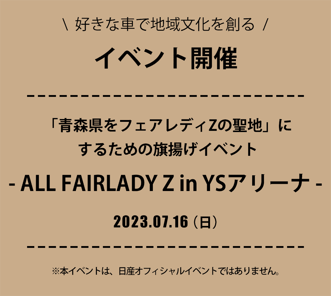 7月16日に開催する「青森県をフェアレディZの聖地」にするための旗揚げイベント- ALL FAIRLADY Z in YSアリーナ -の運営費用に使わせていただきます。