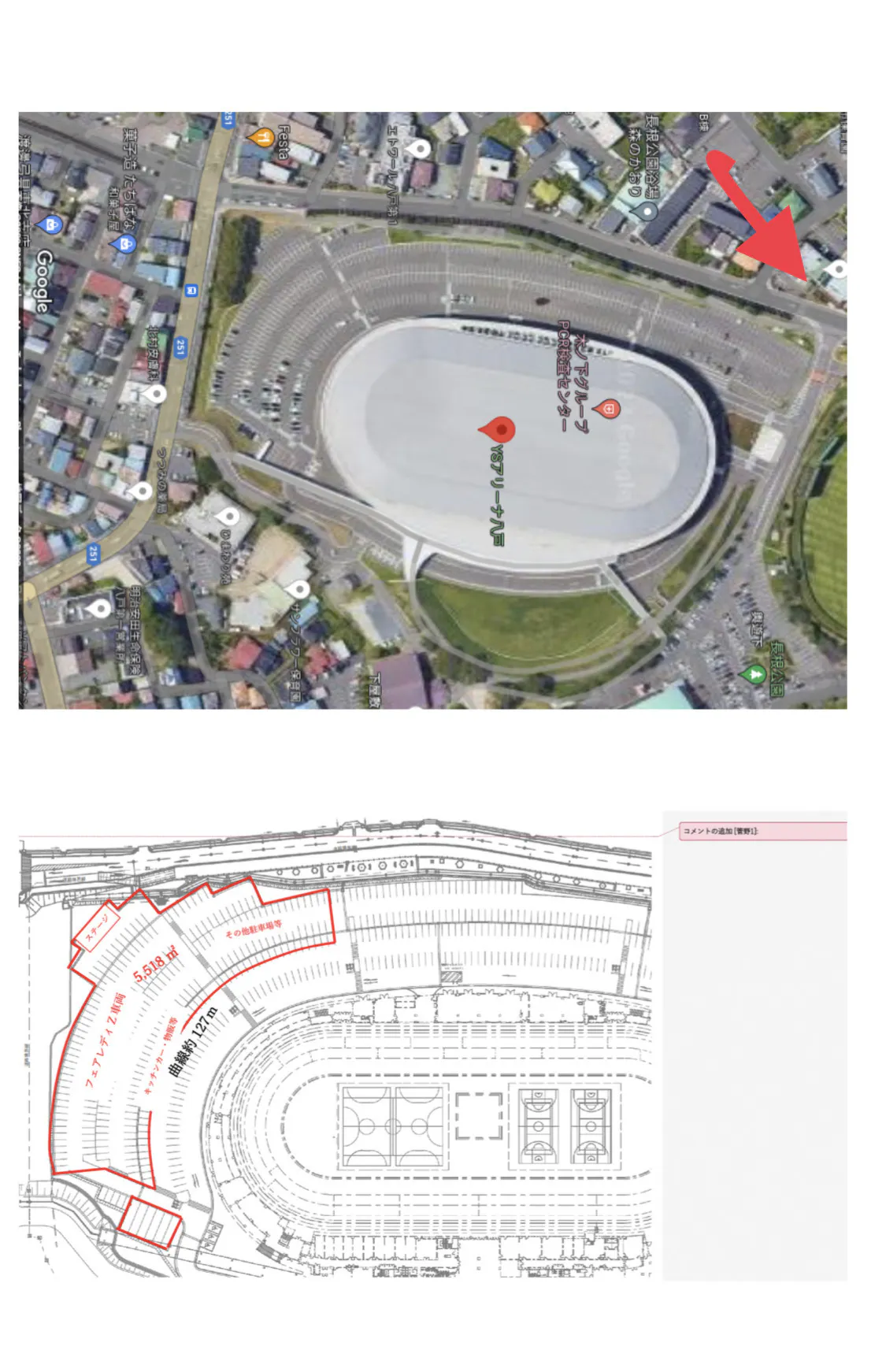 入って奥の駐車場赤印で囲んだ部分が今回