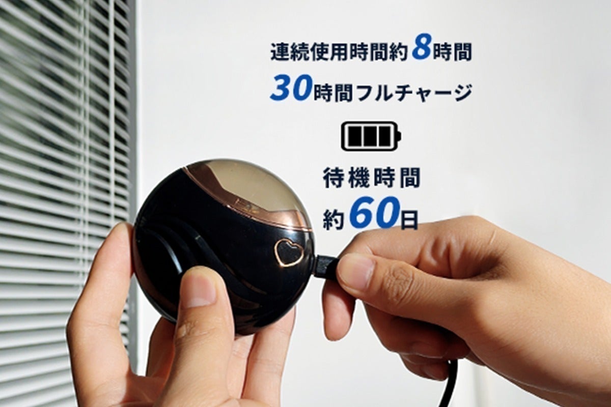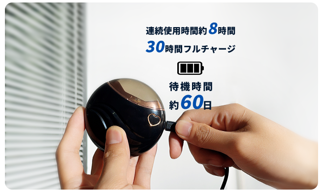 500mAhのバッテリーが内蔵されており、1回のフル充電で約2ヶ月の待機時間があり、8時間連続使用が可能です。