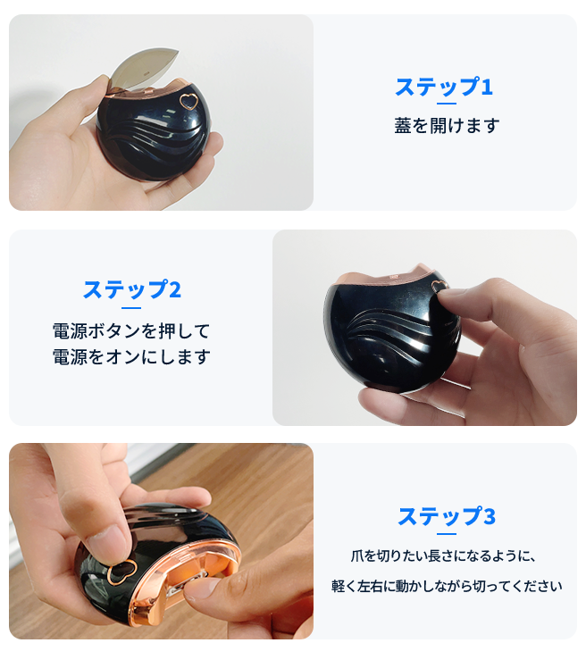 3Dカッターは爪先にぴったりフィットし、爪を傷つけることなく徐々に削って形を整えることができます。45度の斜め回転するローラーカッターは、効率的に爪を削り、美しく仕上げることができます。