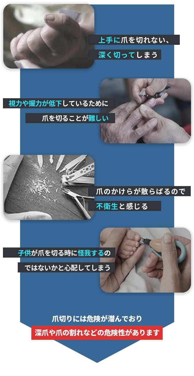 爪を切りすぎると深爪になり、場合によっては爪甲炎を引き起こす可能性もあります。また、爪を適切な長さまで切るためには、単に爪切りを使うだけでは不十分なこともあります。正しい方法で爪を切ろうとすると、様々な道具が必要で、手順も複雑になってきます。今回は、「より簡単なネイルケア」をお届けするために、このプロジェクトを始めました。
