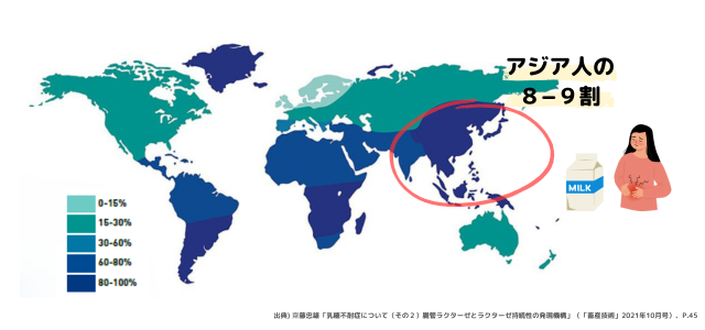 また私自身牛乳を飲むとお腹がゆるくなることが多いなと思っていたのですが、日本人を含むアジア人の8−9割が、乳糖不耐症(腸が、ミルクや母乳に含まれる乳糖という成分を分解・吸収できないことで、下痢や消化不良を起こしてしまう症状)であることも分かりました。