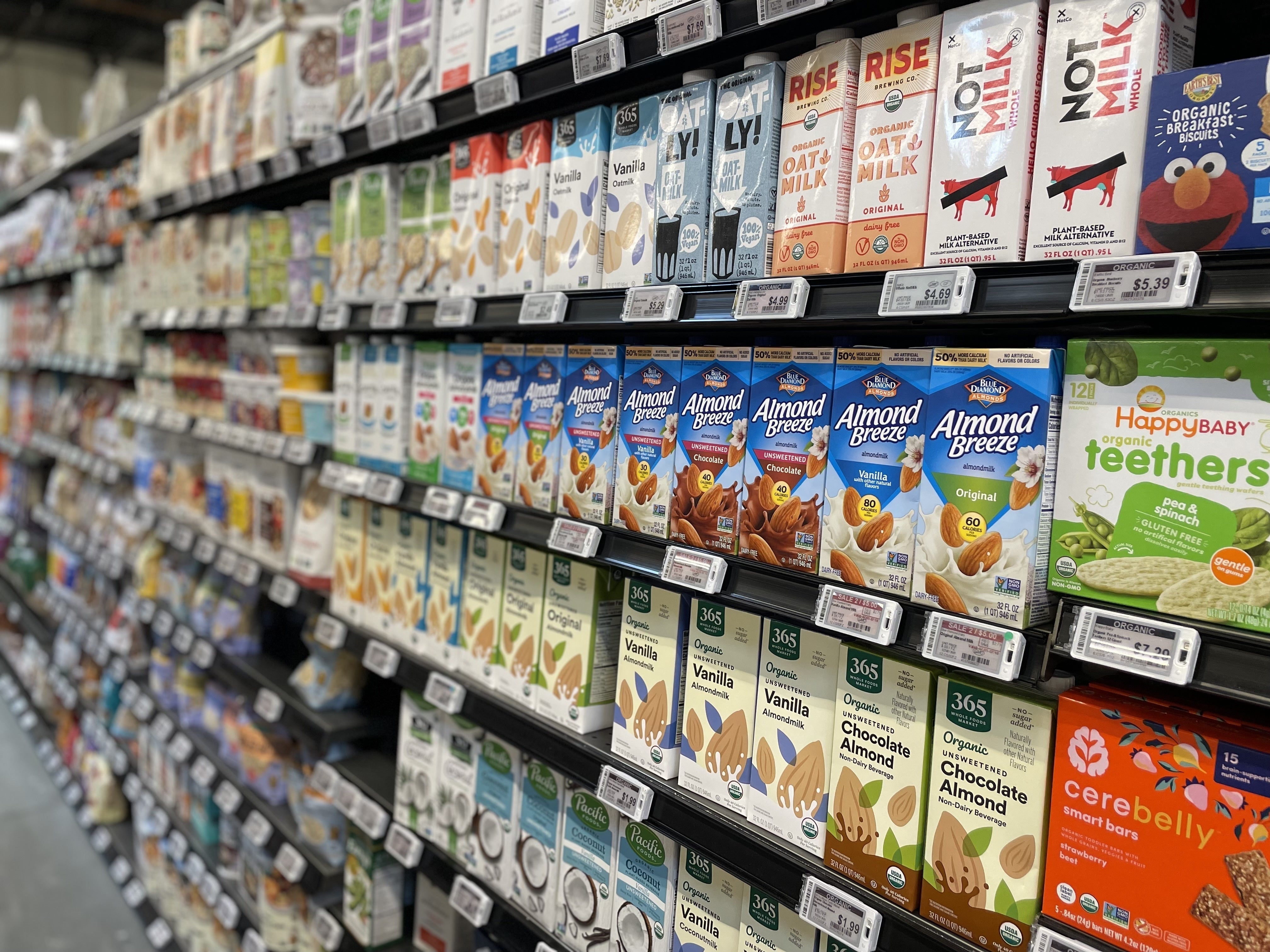 ▲米国のスーパーマーケットの植物性ミルク陳列棚