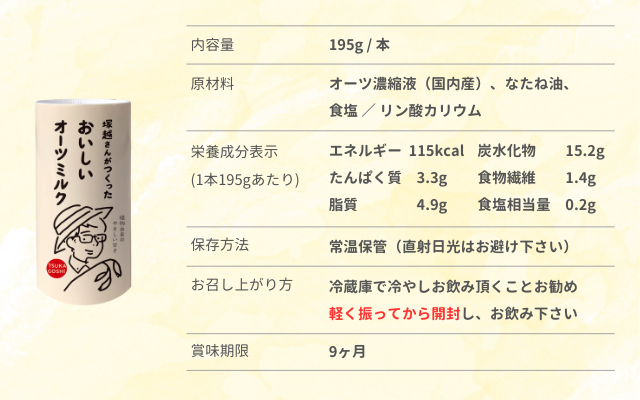 ※本製品で使用しているオーツ麦は、小麦、大豆、そばが混ざる可能性のある方法で収穫されています。
